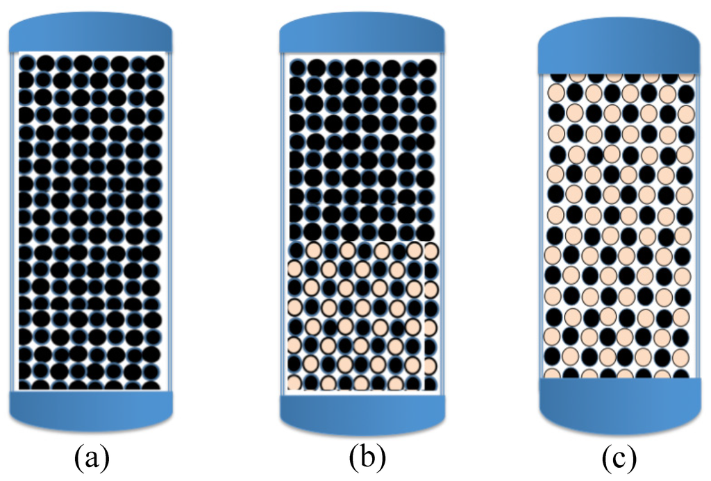 Schematic diagrams of the common design of individual Fe0-based filters: (a) pure Fe0 (100%); (b) a pre-treatment hybrid zone (e.g., Fe0/sand) followed by 100% Fe0; and (c) a fully hybrid system. It has now been established that only fully hybrid systems are sustainable because of the volumetric expansive nature of iron corrosion at pH > 4.5.