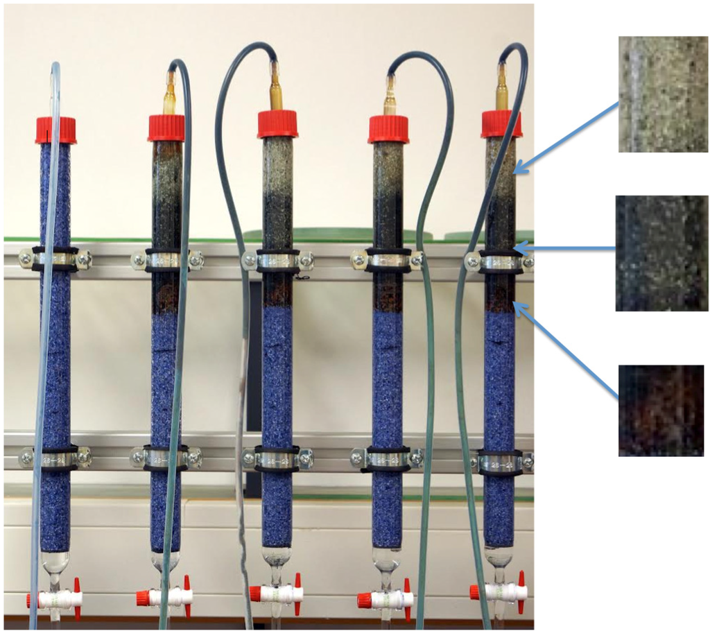 Photograph of a column design depicting the typical sequence of coloration described by Westerhoff and James [124]. It can be seen that the entrance zone of the Fe0/sand zone is colored brown while the upper section is black. The sand layer after the Fe0/sand zone more or less maintains its “white” color or is brownish by FeIII iron oxide from the Fe0/sand zone. Sand in the reference system (first column) and the sand layers preceding the Fe0/sand zone is blue colored by methylene blue (see text).