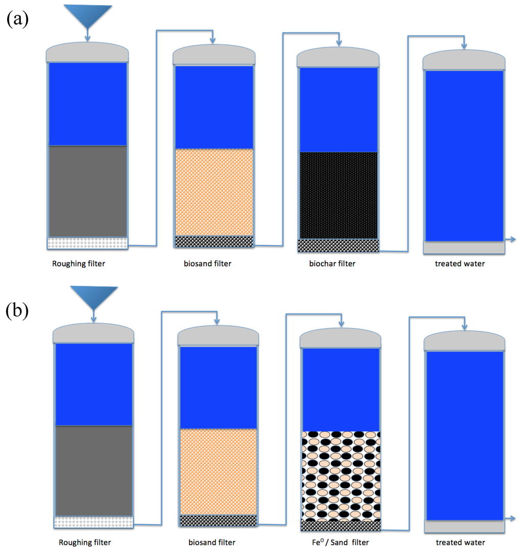- Noubactep, C.; Temgoua, E.; Rahman, M.A. Designing iron-amended biosand filters for decentralized safe drinking water provision. Clean Soil Air Water 2012, 40, 798–807. [Google Scholar] [CrossRef]
