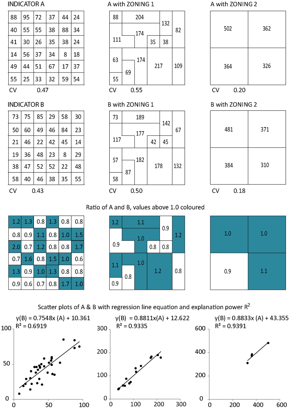 Figure 1 describes these basic ideas behind the MAUP. Two indicators, A and B, can be analyzed together with different zonings. The variables in the example could represent, for example, population and available water. The zoning effect is visible when looking at the change in the coefficient of variation (CV) and the explanatory power of regression (R2). When taking a ratio of the indicators A and B and exploring values above a certain threshold, we can see that results vary depending on the zoning used.
