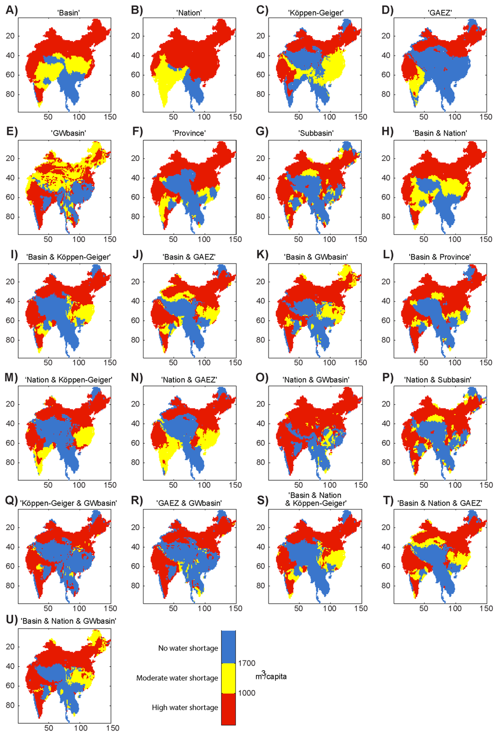 Our results revealed that the spatial extent and population under high water shortage (<1000 m3/cap/year) varied remarkably depending on the zoning used. Our findings also allowed us to identify the areas with the highest frequency of water shortage among the various zonings, namely the areas within the Indus and the Yellow River basins and areas in the northwestern parts of India and China. While nearly all zonings resulted in high water shortage in these areas, the value of the water shortage indicator also varied most in those areas, especially close to these areas where average water availability was higher. This indicates a high level of sensitivity to the selection of the unit of analysis.