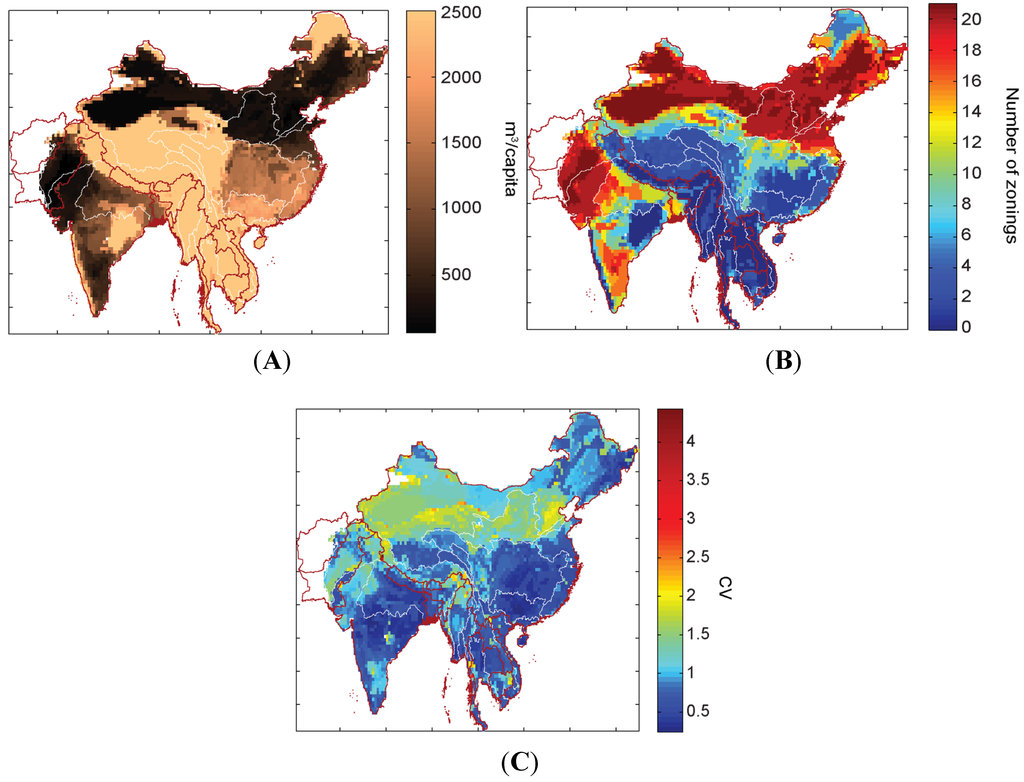 (A) Average water shortage per grid cell calculated based on the 21 zonings; (B) number of zonings under which the water shortage indicator value for grid cell was less than 1000 m3/cap/year; and (C) the coefficient of variation (CV) of water shortage indicator values per grid cell calculated over the 21 zonings.
