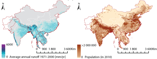 | Preparations in ArcGIS/R | Projection was set to WGS84 (if not originally); Data was converted to raster with ‘features to raster’ tool (if not originally), runoff raster was used as snap raster to ensure grid size and location was exactly the same for all rasters; Grid cells were assigned numerical values representing zone codes; Rasters were clipped according to the outer limits of the 10 major Asian river basins + including all river basins in China & India; Rasters were converted to ASCII; Average annual runoff was calculated in R based on the output of modelled daily surface and subsurface runoff for period of 1971–2000. |