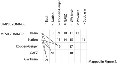 In this study different assumptions about availability, access, and demand relating to water were considered through the use of multiple zonings. Each zoning reflects the inability to obtain water (or goods produced using water) for a particular population from other basins, nations, climate zones, agro-ecological zones, groundwater basins, subbasins, provinces, or combinations of these. In other words, when calculating water shortage indicator, we assume that there are distinct areas within which the population is limited to using only water from the same area. This touches on a number of considerations.