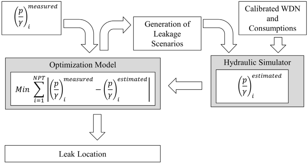The leak location is achieved by simulating hypothetical leakage scenarios. The scenarios presenting pressure values close to those obtained from the field observations are selected. This is done by using an optimization model, which is solved by linking a simulated annealing algorithm with a hydraulic solver (Figure 1). The objective function is formulated to minimize the differences between measured (monitoring data) and estimated (simulation results) pressures.