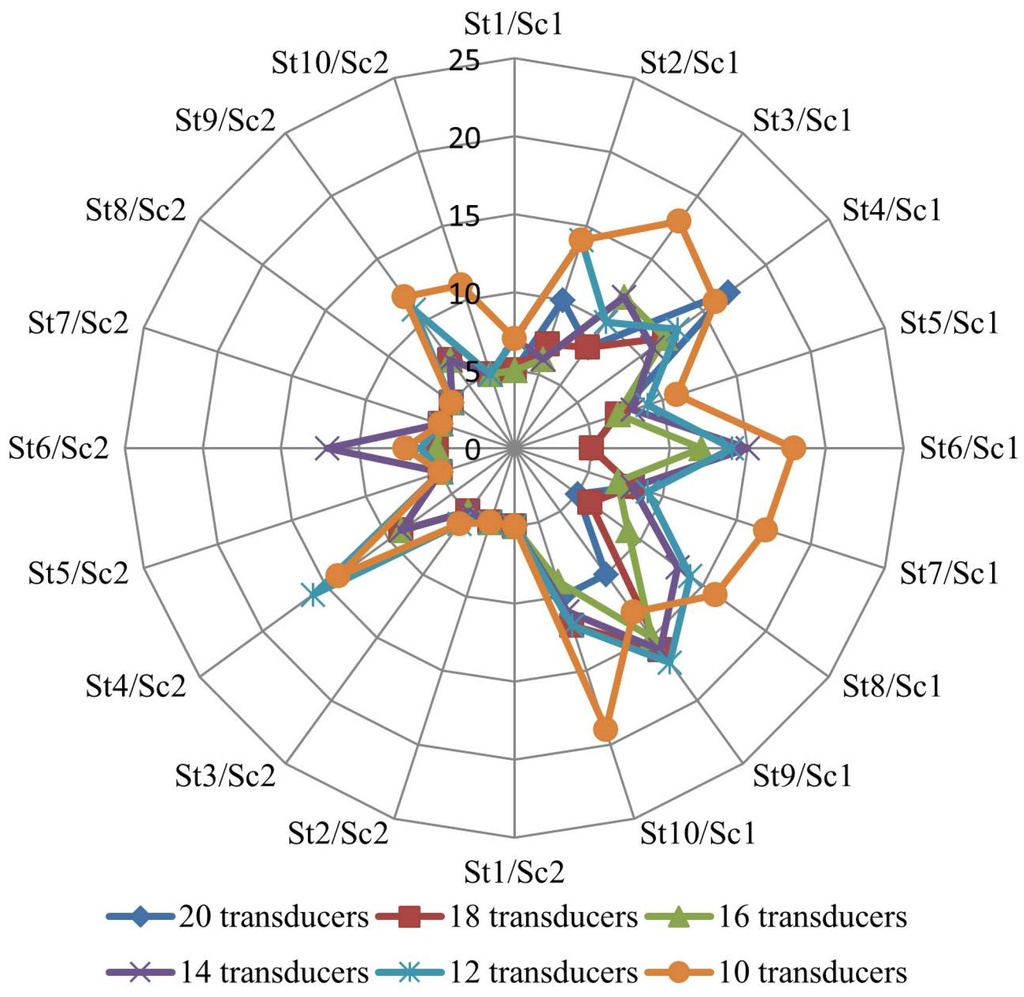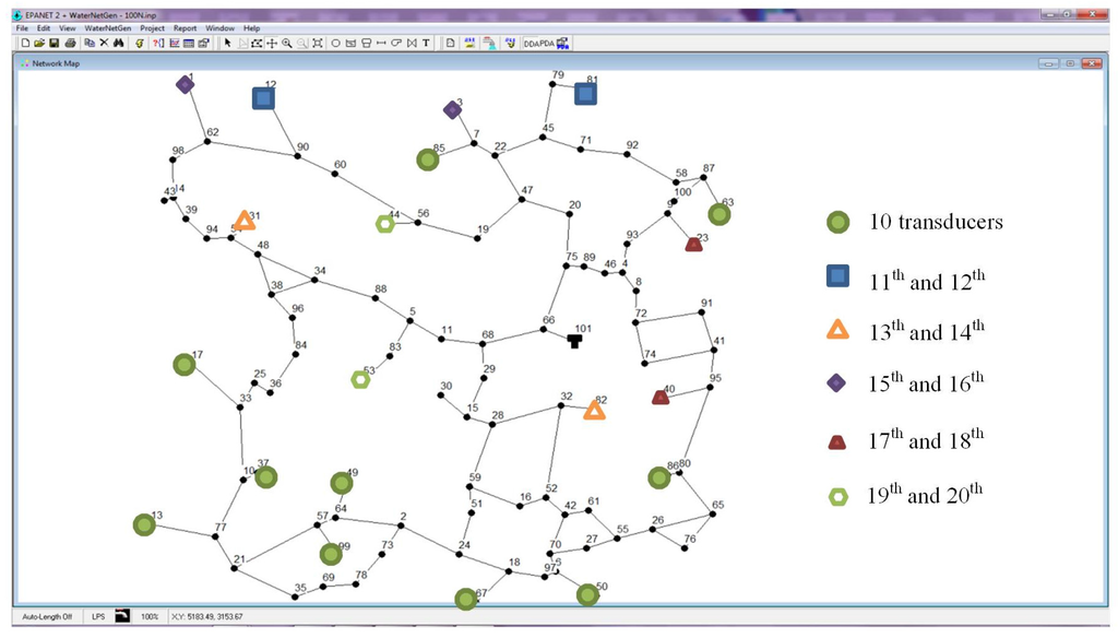 The performance of the proposed methodology is illustrated with 240 case studies created specifically for that purpose. All the case studies use the same WDN (one tank, 100 junction nodes, 111 pipes and 11 loops), but considering two different lengths (each pipe has its original length—first WDN, and half—second WDN), two leakage flow scenarios (1.5 and 15.0 L/s), 10 random spatial distributions of the leakage flows (situations presented in Table 2 and illustrated in Figure 3) and collecting data from six different sets of monitoring nodes (10, 12, 14, 16, 18 and 20 pressure transducers).