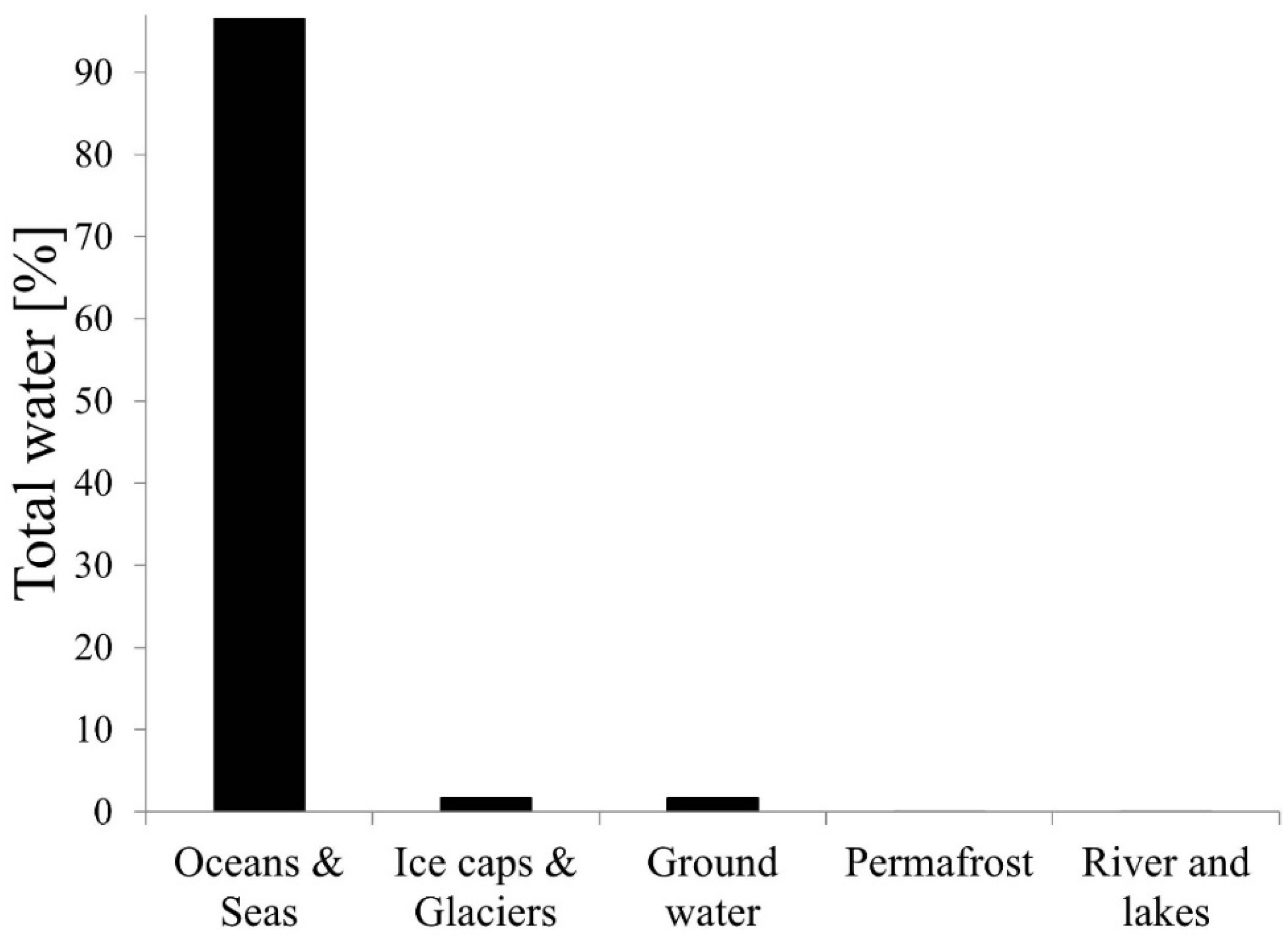 Hydrometeorology is an interdisciplinary field of research that combines knowledge from the atmospheric sciences and hydrology to study the transfer and exchange of water and energy between land and the lower atmosphere. This field of research can be seen to exist at the interface of two well-developed disciplines, meteorology and hydrology. In general, hydrometeorology provides ever-advancing knowledge about the hydrological cycle, which is an integral part of the wellbeing of humankind on Earth [1]. The scope of hydrometeorology research is clearly interdisciplinary and includes analysis of the space-time properties of proxy parameters such as precipitation, maximum precipitation amount, minimum and maximum temperatures and their influence on river systems and dams. In this regard, this field of research is concerned with a broad understanding of the complex interactions between weather and the water resources of the earth [1]. It is worth mentioning that water is one of the most common substances on the surface of the earth, with a total volume of ~1,386,984 × 103 km3 in various storage locations or reservoirs, as depicted in Figure 1.