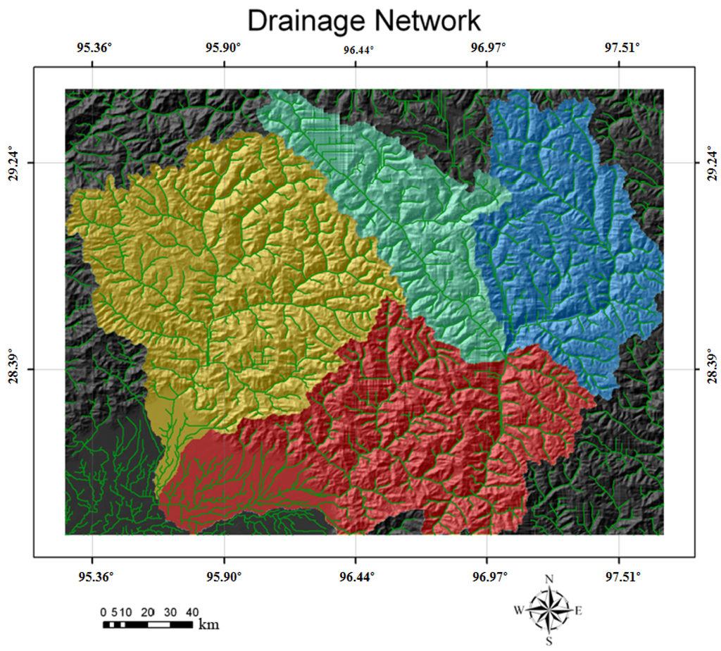 The drainage system in the Puqu Fault Region. Different colors indicate diverse subbasins extracted.