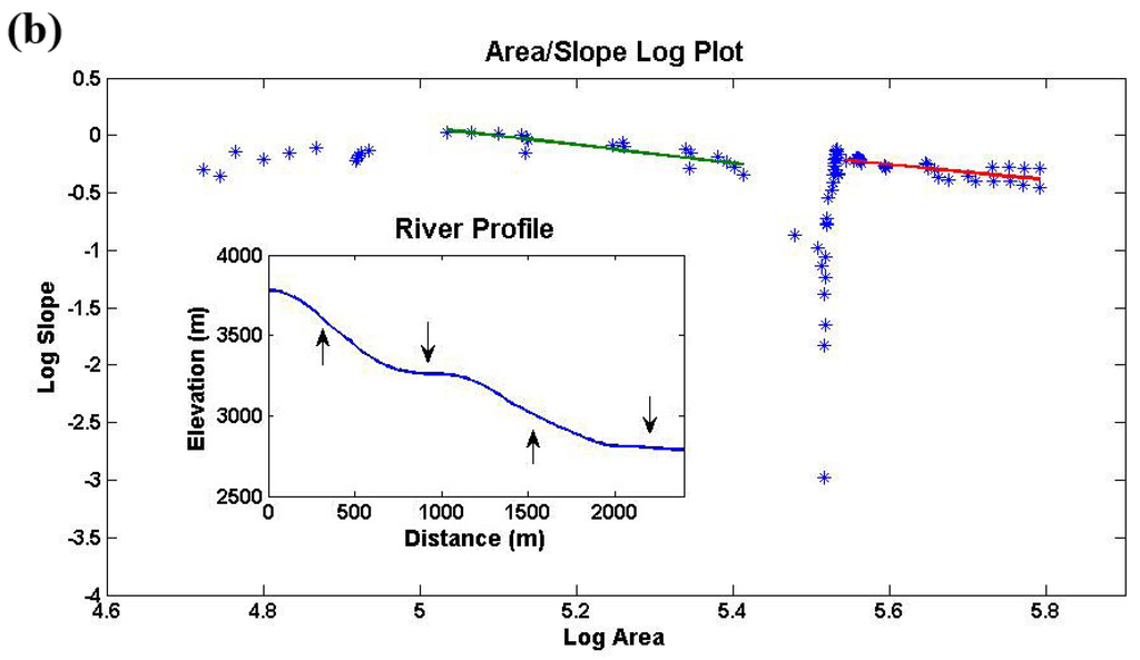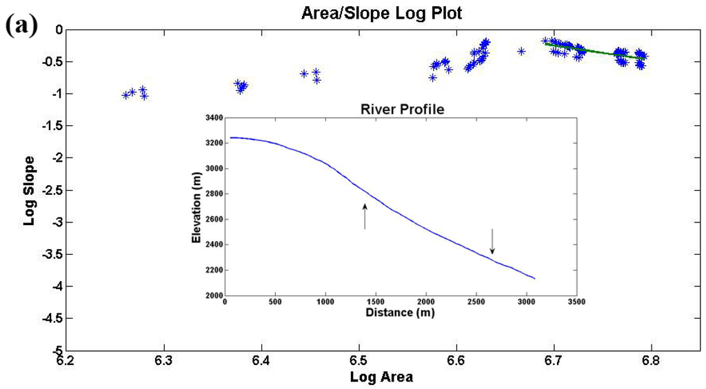 After extracting the river network in the Puqu Fault region, the next step is to derive the channel parameters such as concavity and steepness from stream elevation profiles. In this study the concavity and steepness were calculated directly from regressions on logarithm slope-area plot. Based on Equation (1), when taking logarithm on both sides of the equation, the equation can be written as: