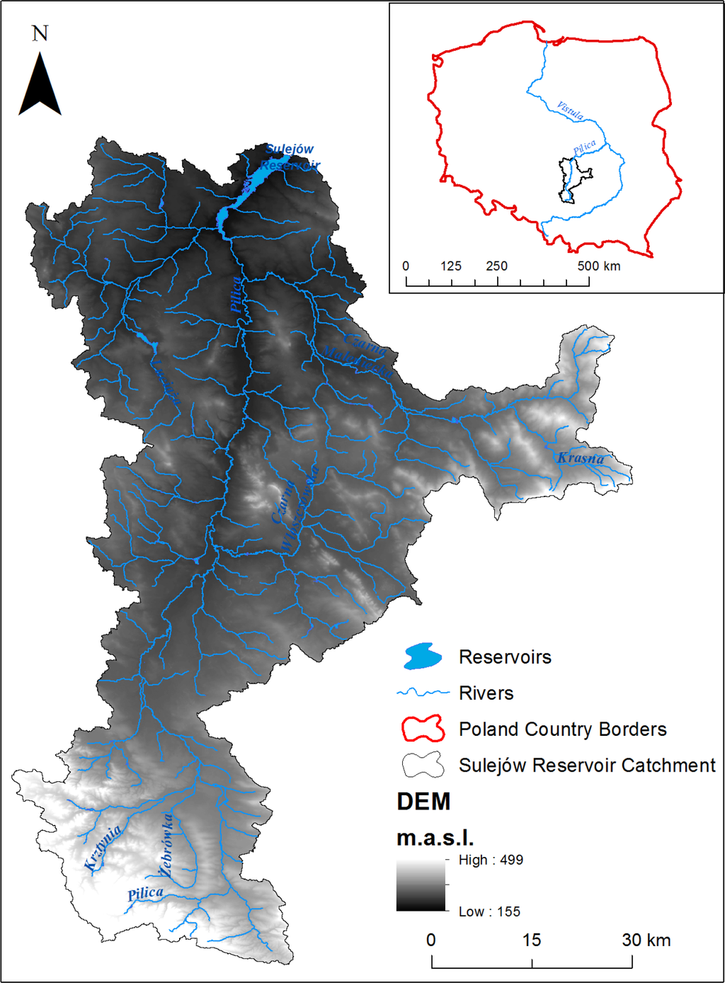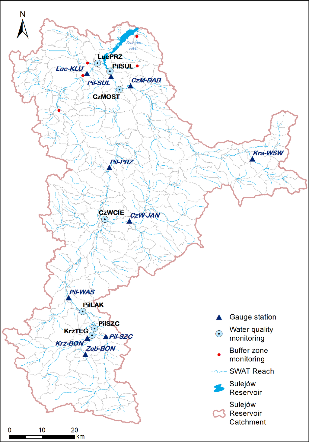 The SWAT model is used in this study for the entire SRC area upstream of the dam, which occupies 4933 km2 (Figure 1). This area consists of the Pilica (contributing 79.8% of area) and the Luciąża (15.3%) River catchments and a direct reservoir sub-catchment with several smaller streams (4.9%). The elevation of the SRC varies from 154 m in the lowland areas in the north to 499 m in the highland areas in the south. The distribution of land cover in the SRC area is as follows: 44.4% arable land, 38.6% forest areas, 12.3% grasslands, and 4.7% urban areas (mainly low-density residential areas), with the remaining land occupied by other types of land cover (data according to Corine Land Cover 2006). The predominate soil types in this area are loamy sands and sands. The climate of this area is typical for central Poland, with a mean annual temperature of 7.5 °C and mean January and July temperatures of −4 °C and 18 °C, respectively. The mean annual precipitation is 600 mm. The highest amounts of precipitation occur in June/July, and the lowest amounts of precipitation occur in January. The flow regime is characterized by early spring snow-melt induced floods and summer low flows with occasional summer floods. The quantitative pressure on surface water resources is relatively low. The fish farming industry scattered around the catchment and the Cieszanowice Reservoir constructed in 1998 on the Luciąża River (volume of 7.3 × 10 m3 at full capacity) are the only considerable sources of flow alteration.