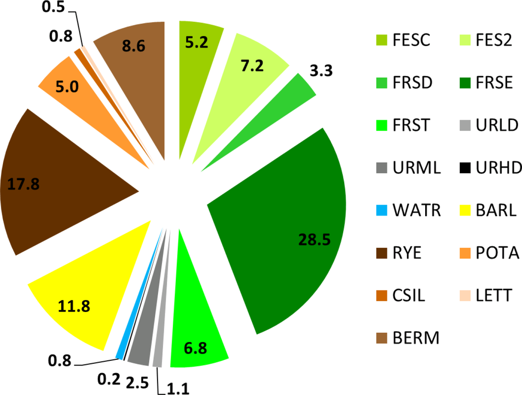 Overall, the following five crops were distinguished as well as a fallow/abandoned land class (BERM): spring barley (BARL), rye (RYE), potato (POTA), corn silage (CSIL) and head lettuce (LETT). Figure 3 shows the final distributions of all land cover classes in the SWAT model setup.