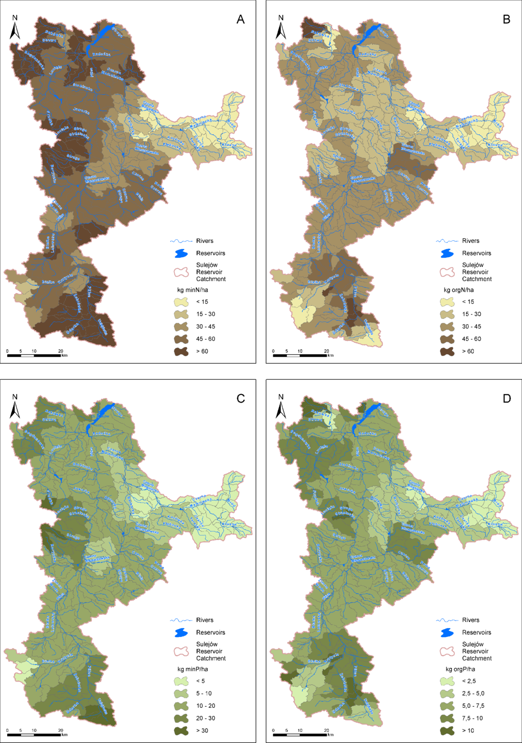 Diffuse N and P pollution from agricultural fields mainly results from fertilizer use. SWAT enables us to define crop- and soil-specific management practices scheduled by date for each agricultural HRU. Typical management practice schedules, including the dates, types and amounts of fertilization, were obtained by consulting local extension service experts. First, derived management schedules were assigned to agricultural HRUs by using the ArcSWAT interface. However, this approach typically leads to bias in the total amounts of spatially-averaged fertilizer when compared with data from external sources. In this study, we used commune-level data from the Central Statistical Office (as for 2010) to determine mineral fertilizer use and livestock population. The livestock population was used to calculate the amount of available organic fertilizer (manure or slurry). In the final step conducted using GIS software, correction factors for fertilizer rates were defined for the sub-basins that overlapped with different communes. The commune layer intersected the sub-basin layer so that the total amounts of fertilizer used annually in different communes (expressed in tons of N and P) could be distributed over the SWAT sub-basins proportionally to the area of agricultural land in each sub-basin. Simultaneously, we aggregated the total fertilizer use per sub-basin from the model output based on initially implemented management schedules. Next, correction factors were calculated for each sub-basin as the ratios of total fertilizer use at the sub-basin level from census data to the total fertilizer use obtained from the SWAT output files. In the final step, each HRU fertilizer rate in the operation schedules was adjusted using the calculated correction factors. After this adjustment, the bias in the spatially averaged amounts of fertilizer largely decreased. Figure 4 shows the final, sub-basin-averaged rates of mineral and organic fertilizers applied in the SWAT model of the SRC.