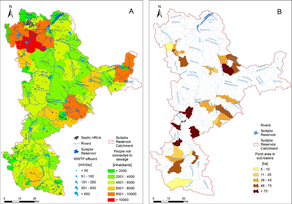 In contrast, multiple point and non-point pollution sources in the area result in elevated N and P loads flowing into the Sulejów Reservoir, which eventually contribute to toxic cyanobacterial blooms in its waters. These different sources will be described systematically in terms of SWAT model inputs in Sub-Section 2.4.