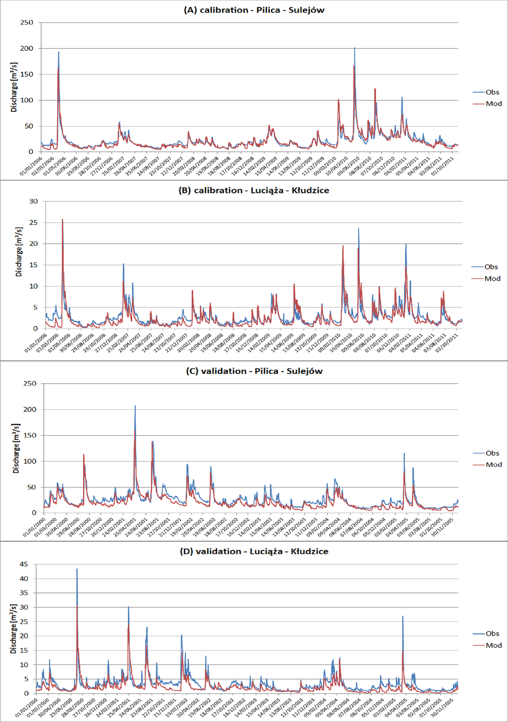 Table 3 presents the model performance measures for the calibration and validation periods of the three modeled variables. Figure 6 shows simulated vs. observed hydrographs for the two main gauges (the last stations on the Pilica and Luciąża before the Sulejów Reservoir). The hydrographs for the remaining 8 gauges are shown in Figure S1 of the Electronic Supplement. The goodness-of-fit values and a visual inspection of the hydrographs both demonstrate good model performance for simulating daily flows in the SRC. However, a few deficiencies were noted.