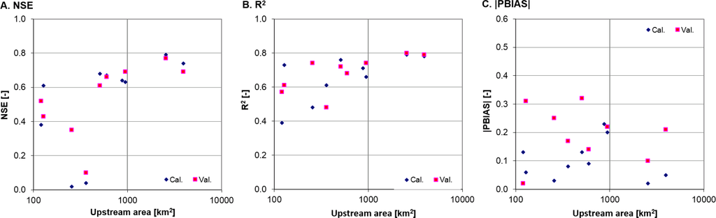 For the three upstream gauges with relatively small catchment areas (less than 360 km2) the values of NSE were smaller than 0.5 for either the calibration or validation period.