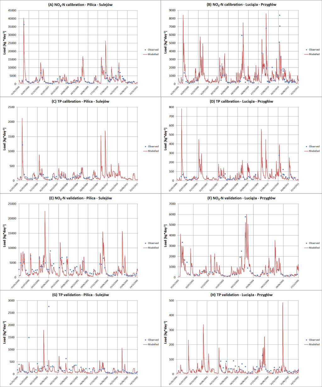 Calibration was performed in three steps, beginning with continuous daily discharge, continuing with irregular (approximately one measurement per month) and daily NO3–N loads and ending with TP loads. The calibration period was from 2006 to 2011, and the validation period was from 2000 to 2005. Figure 2 presents the locations of the 10 flow gauging stations (data acquired from IMGW-PIB) and 7 water quality monitoring stations (concentration data acquired from the General Inspectorate of Environmental Protection), from which the time series were used for calibration and validation. The average daily loads (kg · day−1) on the sampling dates were calculated based on observed daily discharge data (m3 · day−1) at the closest flow gauging station. If the flow gauging station was situated at another location than the water quality station, discharge data were scaled using catchment area ratios. We evaluated the relationships between the NO3–N and TP concentrations and discharge for all studied gauges and concluded that the correlations were too low (median R2 equal to 0.2 for NO3–N and 0.03 for TP) to use any regression-based methods for continuous load estimation.