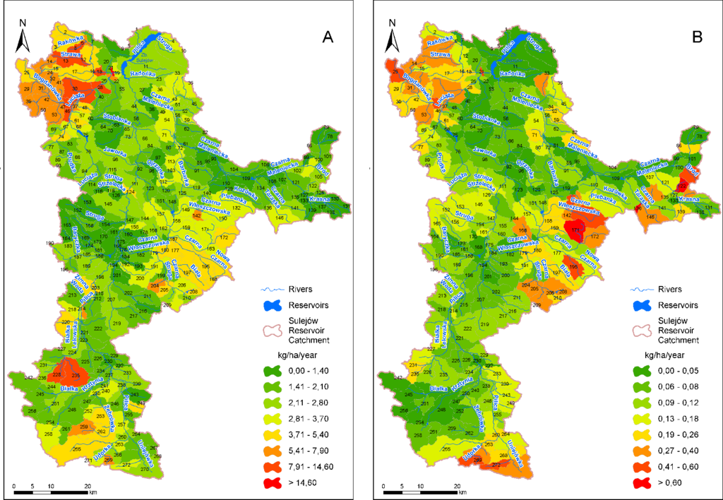 Figure 9 shows the mean emissions at the sub-basin level of NO3–N (A) and TP (B) from land areas to the stream network. These emissions include all of the possible pathways of the studied constituents from the sub-basins to SWAT reaches via surface runoff, sub-surface runoff, tile drain outflow and base flow. The results are expressed per unit of catchment (not just agricultural) area. Therefore, the results indirectly incorporate the effects of different areas of agricultural land in different sub-basins. For nitrogen and phosphorus, the spatial variability of the calculated emissions is very high. The difference between the sub-basins with the highest and the lowest emissions is two orders of magnitude for NO3–N and three orders of magnitude for TP.
