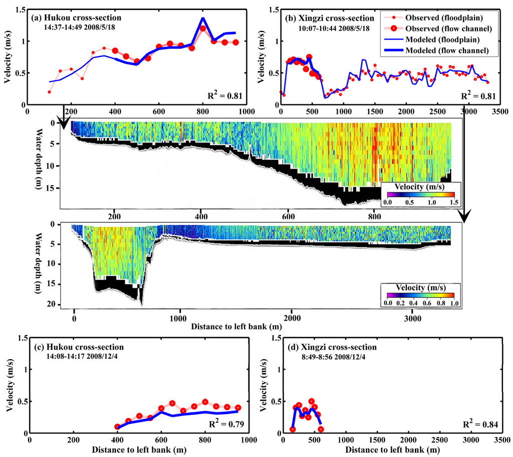 Comparison between depth-averaged velocity magnitudes from ADCP observations and simulations at two cross-sections of Hukou and Xingzi for periods of rising (a,b) and low water levels (c,d). Note that the insert chart represents the ADCP velocity profile observations sampling every 1 s.