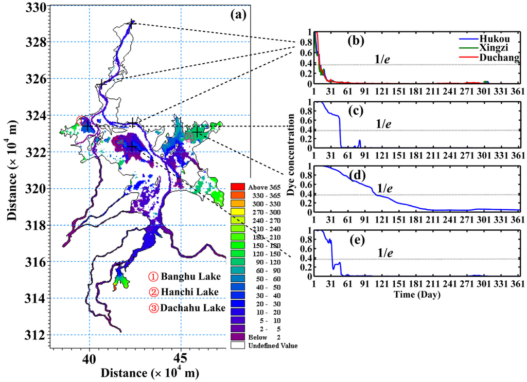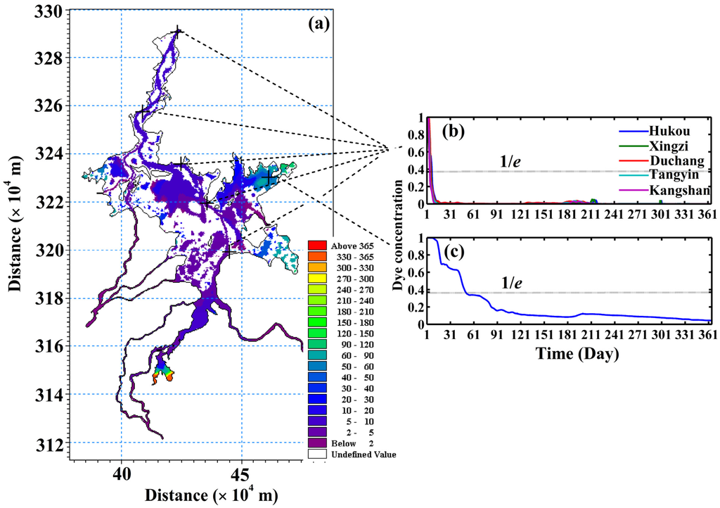 - The frequency distribution curve of the lake’s residence time provides useful generic information regarding the degree of variation in flushing across the lake domain. The curves of the shallow gradients for Poyang Lake indicated higher spatial variability in residence times. Additionally, the characteristic ‘step’ of the frequency distribution curve demonstrates that the Poyang Lake domain is divided into fast (the main flow channels of the lake) and slow (some bays adjacent to the lake shorelines) flushing systems.