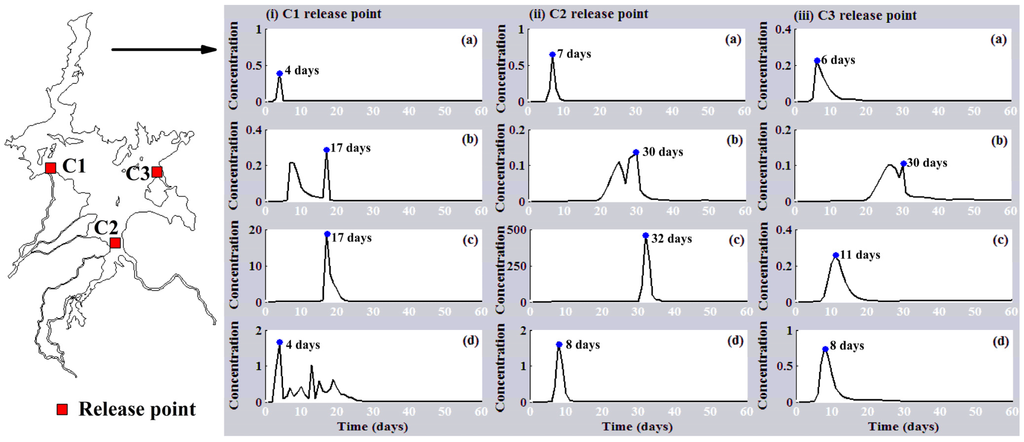 Residence time (e-folding time in the present study) was measured to track the spatial and temporal distributions of a conservative tracer following its uniform distribution throughout the lake at an initial concentration (instantaneous release) corresponding to 100% (arbitrary unit; kg/m3 used in this study) and a concentration of zero at the boundaries. Consequently, the e-folding times for each computational cell of the hydrodynamic model MIKE 21 were obtained to show the spatial distributions of the residence times. Seasonal variability in water circulation implies a need to perform separate simulations for various water level regimes of Poyang Lake. Hence, the releases were assumed to take place in the spring (on the 1st of April; water level rising period), summer (on the 1st of July; high water level period), autumn (on the 1st of October; water level recession period) and winter (on the 1st of January; low water level period). Subsequently, the travel times were calculated for these four seasons by assuming continuous injection of a conservative tracer at three different locations (see Section 4.3 for more detail). Three locations were chosen because they best represented the pollution sources frequently occurring at the mouths of the rivers entering Poyang Lake [23,24]. In these locations, the tracer was released continuously (1.0 kg/m3 used in this study) over a period of 24 h (i.e., the first day of the simulations), and a concentration of zero was imposed for the boundaries and for any other areas in the lake domain. Finally, travel times were determined based on the simulated peak concentrations at the lake outlet (Hukou).