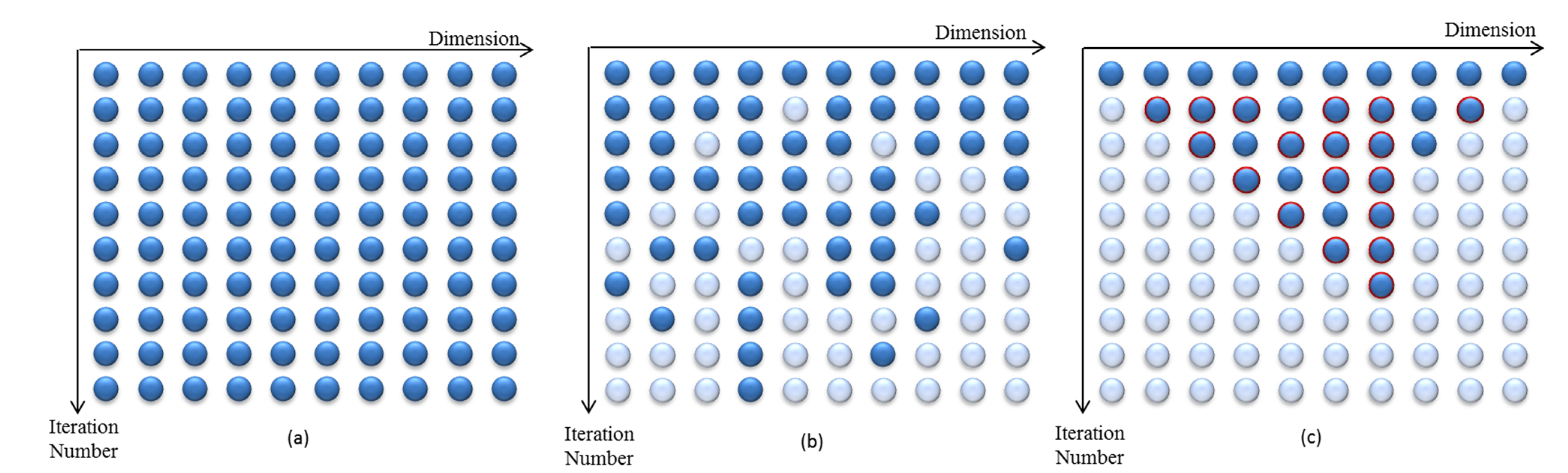 - Calculate the probability of choosing to search based on its cumulative sensitivity from beginning to iteration : .