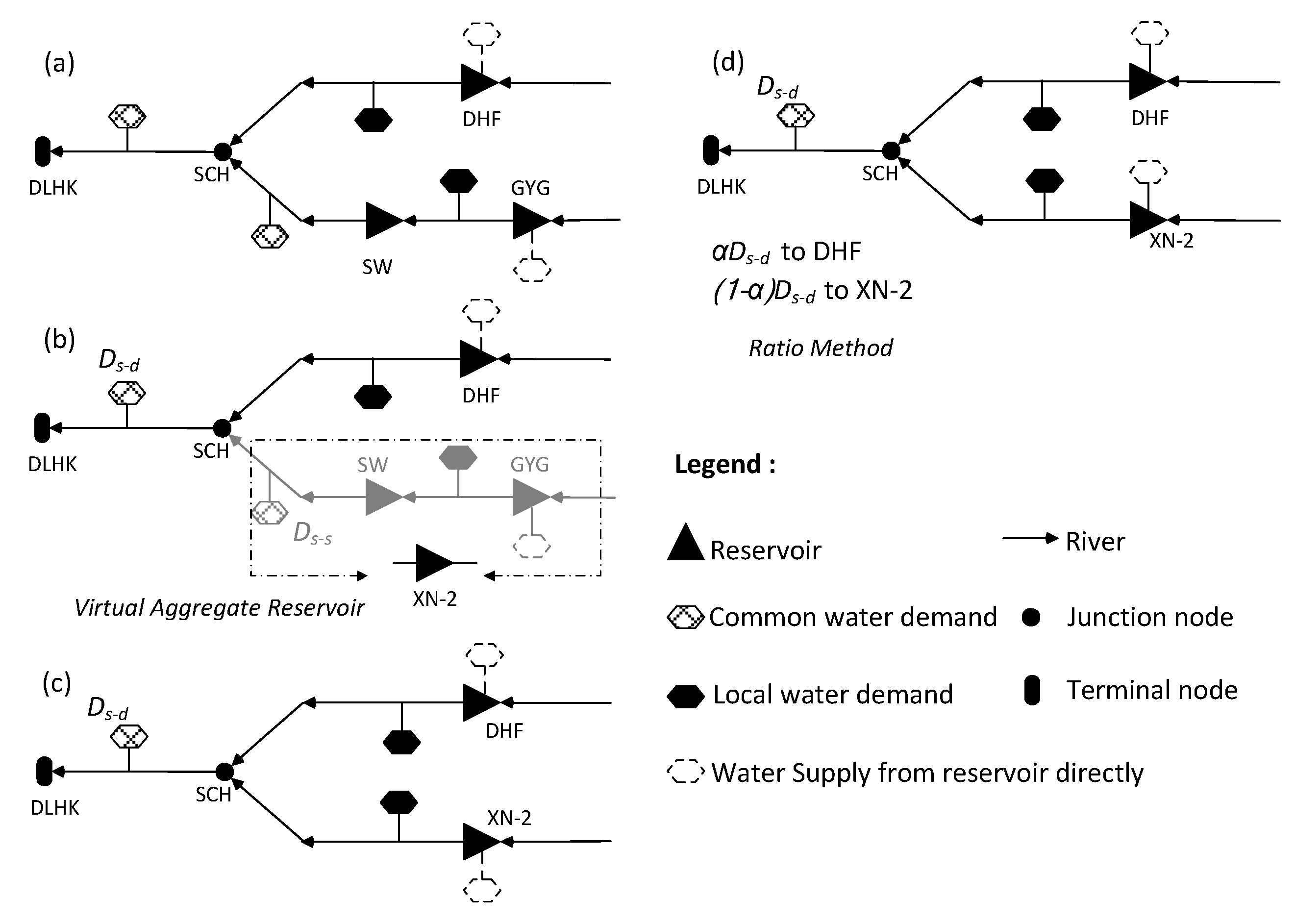 - Liu, P.; Guo, S.; Xu, X.; Chen, J. Derivation of aggregation-based joint operating rule curves for cascade hydropower reservoirs. Water Resour. Manag. 2011, 25, 3177–3200. [Google Scholar] [CrossRef]