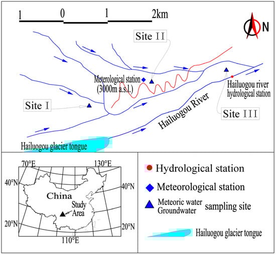 The hydrological regimes have been seriously affected by the changes in glaciation and snow cover on the Tibetan Plateau [16]. As the highest mountain on the eastern margin of the Tibetan Plateau, Mount Gongga is the largest area of modern glaciation in the Hengduan Mountains and one of the principal glacierized areas controlled by the monsoonal climate in the southwest of China. Owing to the distinct characteristics of this alpine region, including its diverse topography, geology, climate, and hydrology, it has hosted many scientific investigations [17,18,19,20,21]. Located on the eastern slope of Mount Gongga, Hailuogou (HLG) watershed is an ideal location for studying the distinctive hydrologic regimes of this alpine area. To develop a baseline assessment of the components and the generation mechanism of groundwater in this headwater region, data on isotope hydrology have been generated almost monthly between May 2008 and November 2009.