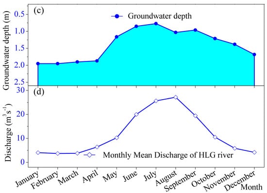 Seasonal variation of groundwater depth (m), temperature (°C), precipitation (mm), and river runoff (m3/s) at the HLG hydrological station: (a) the mean monthly temperature from 1988 to 2009; (b) the mean monthly precipitation from 1988 to 2009; (c) the groundwater depth during the observation period; and (d) the mean monthly discharge of the HLG River from 1994 to 2009.