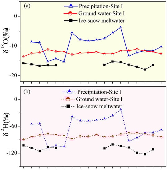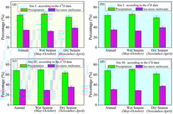 Figure 6 shows the percentages of ice-snow meltwater and precipitation that contribute to groundwater at site I and site III, highlighting a marked seasonal variation. Specifically, we compare the calculated percentages of the water components based on δ18O values with those based on δ2H values. According to the δ18O data on water collected in this investigation period, at site I, the calculated fraction of ice-snow meltwater is 35% on average over the year—that is, 33% in the wet season and 39% in the dry season—and that of precipitation is 65% (67% in the wet season and 61% in the dry season) (Figure 6a). And according to the δ2H data, at site I, the calculated fraction of ice-snow meltwater is 36% on average over the year—that is, 33% in the wet season and 40% in the dry season—and that of precipitation is 64% (67% in the wet season and 60% in the dry season) (Figure 6b). According to the δ18O data, at site III, the calculated fraction of ice-snow meltwater is 31% on average over the year—that is, 30% in the wet season and 36% in the dry season—and that of precipitation is 69% (70% in the wet season and 64% in the dry season) (Figure 6c). And according to the δ2H data, at site III, the calculated fraction of ice-snow meltwater is 31% on average over the year—that is, 29% in the wet season and 38% in the dry season—and that of precipitation is 69% (71% in the wet season and 62% in the dry season) (Figure 6d). The results of this calculation on the basis of δ18O are in line with those on the basis of δ2H, and the groundwater at site I is slightly more dominated by precipitation than that at site III. The results of this simple calculation attest to the fact that (1) groundwater in this alpine glacierized region is dominated by recharge from precipitation and ice-snow meltwater; (2) ice-snow meltwater plays an important role in the recharge of groundwater; and (3) the isotopic composition of groundwater is temporally variable, depending mainly on its sampling time.