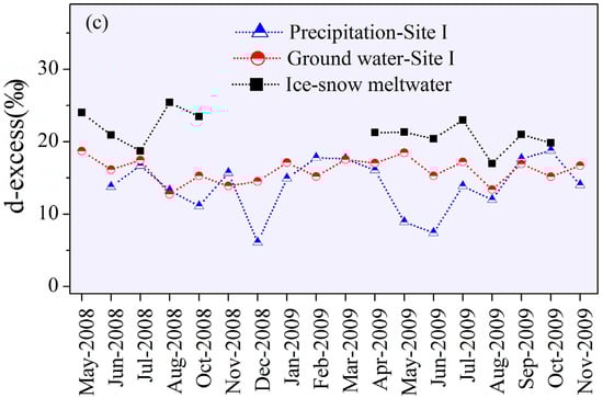 Figure 3c show the variations in the d-excess of waters collected in the HLG watershed during the investigation period. There is a marked seasonal variation in the d-excess values of precipitation (Figure 3c), while the d-excess values of groundwater and ice-snow meltwater both show a relatively uniform signature (Figure 3c). This pattern of variability in the d-excess of groundwater may be explained by the attenuation of the seasonal d-excess signal of precipitation during infiltration. The precipitation contains relatively low values of d-excess, the groundwater contains relatively intermediate values of d-excess, and the ice-snow meltwater contains relatively high values of d-excess. This result indicates that (1) there is a significant inverse correlation between the d-excess value and the values of δ18O and δ2H for the water samples collected; (2) the d-excess features of groundwater can be explained by the input of ice-snow meltwater with relatively high values of d-excess in addition to precipitation; and (3) the d-excess signal of groundwater may be induced by different fractions of water component inputs in groundwater, instead of watershed-related evaporative enrichment or “evaporated” precipitation.