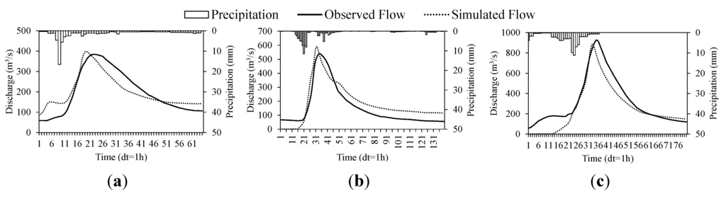 In order to investigate the response of Liuxihe model to various flood condition, three different types of floods with small, medium, and large magnitudes were selected from the available data set. These typical flood events with different magnitudes were selected with flood frequency of 75%, 50%, and 25%, respectively. The characteristics of these floods were listed in Table 2.