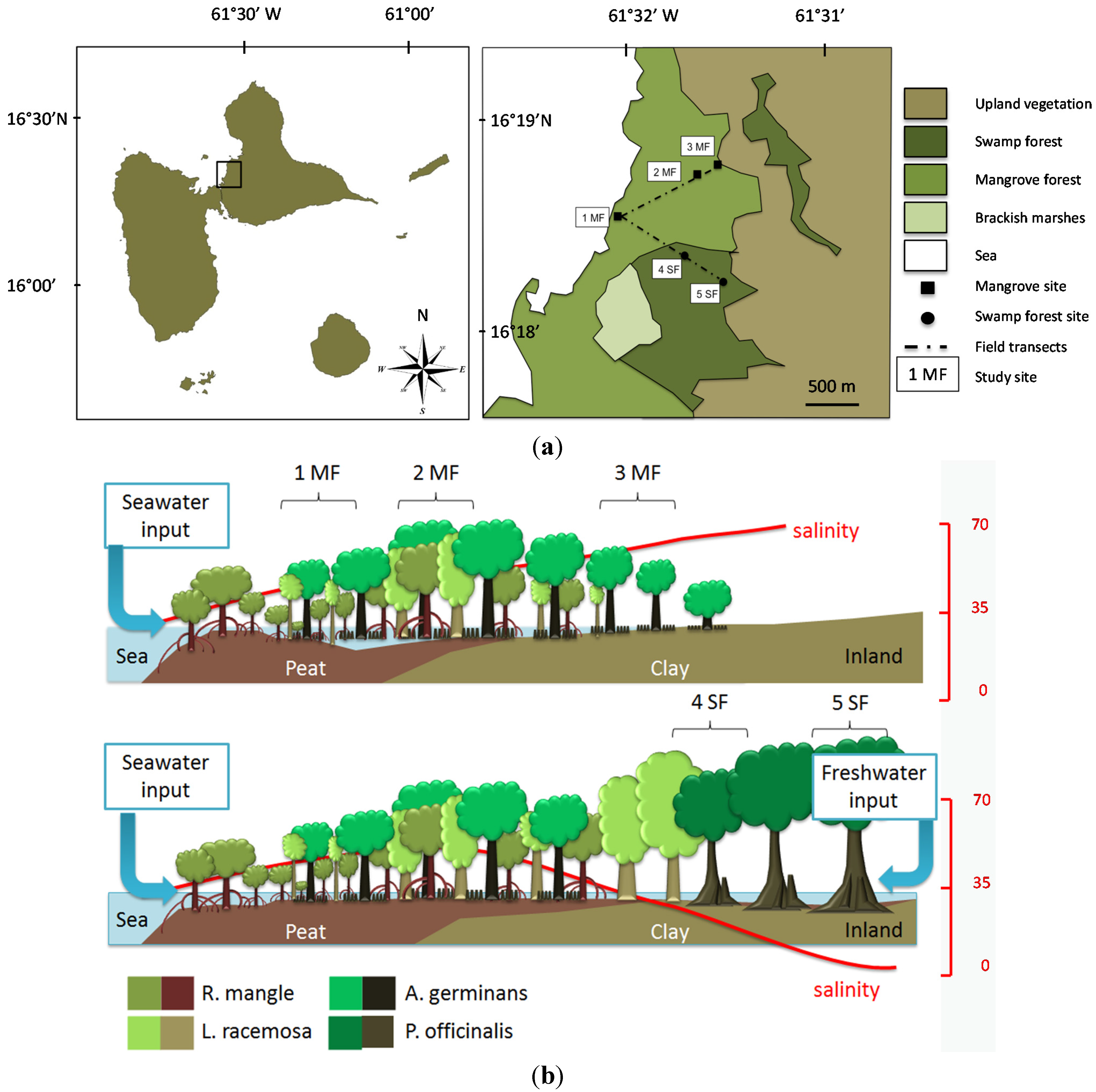 The study area is located along the Bay of the Grand Cul-de-sac Marin, Guadeloupe, Lesser Antilles (Figure 2a). Floristic and physiognomic changes occur in relation to a landward/seaward gradual variation in soil waterlogging and salinity (Figure 2b). The limestone bedrock is overlaid by clayey sediments which are overtopped by peat seaward. A total of five sampling sites were selected along two transects and have been studied for two years, from January 2011 to December 2012. On the sea front, the mangrove forest consists of a narrow, monospecific belt of Rhizophora mangle trees. A few meters landward, the vegetation turns into a shrubby (less than 7 m high), mixed formation with R. mangle, Laguncularia racemosa and Avicennia germinans occurring together (study site 1MF) on a peat soil with low bulk density (22.4 kg·m−3). In the inner part of the study area, the canopy is much denser, with trees heights up to 15 m and above. The study site 2MF is located in this part of the forest, in a mixed stand supporting the three above-mentioned species on a clayey soil of higher bulk density (106.7 kg·m−3). The third study site (3MF) is located at the landward edge of the mangrove forest. Here the substrate is constituted by hyper-saline, very dense clayey sediments (166.1 kg·m−3). It consists of a low (4–6 m) monospecific A. germinans stand. The two last sites are located in the nearby swamp forest dominated by Pterocarpus officinalis. Site 4SF is closed to the mangrove edge, whereas site 5SF is located landward where groundwater salinity is very low (ca. 7 g·L−1). The soil is clayey with intermediate bulk density (89.3 and 71.1 kg·m−3 for 4SF and 5SF respectively).
