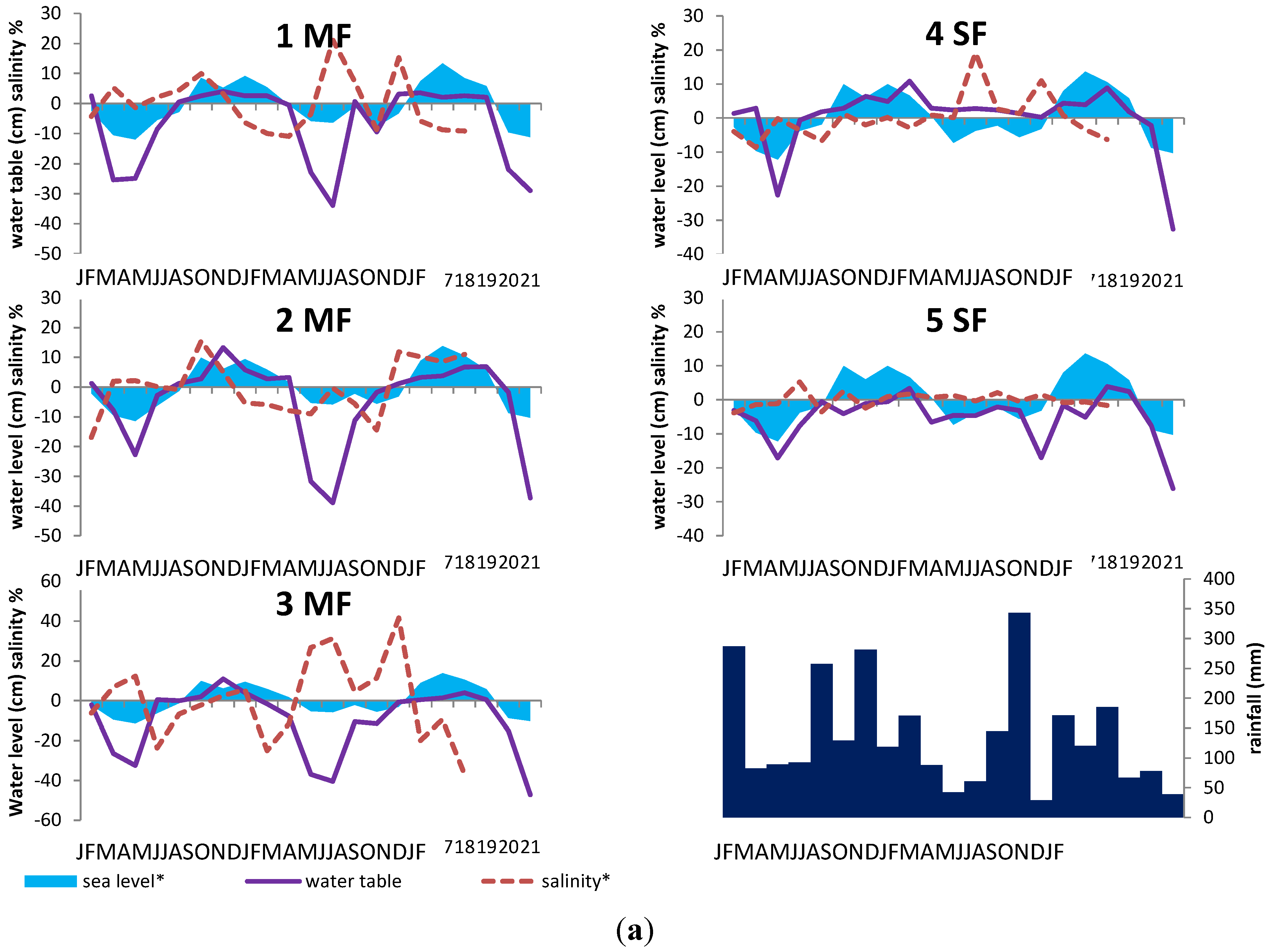 Water level is influenced both by rainfall and by sea level. Water-table level is high/low when both rainfall and sea level are high/low. In stands near to the seashore, like at site 1MF, water level is mainly controlled by the sea level (40% of the variance). On the contrary, in more inland stands like (e.g., 4SF and 5SF), water level depends mainly on rainfall amounts. For all sites, soil salinity is less explained by rainfall amounts and sea level than water level. Except for site 5SF, salinity tends to increase when rainfall amounts and sea level decrease. In the swamp forest, soil salinity variations result mainly from the amount of rainfall; conversely, in the mangrove forest, rainfall alone is a very weak descriptor of salinity variations.