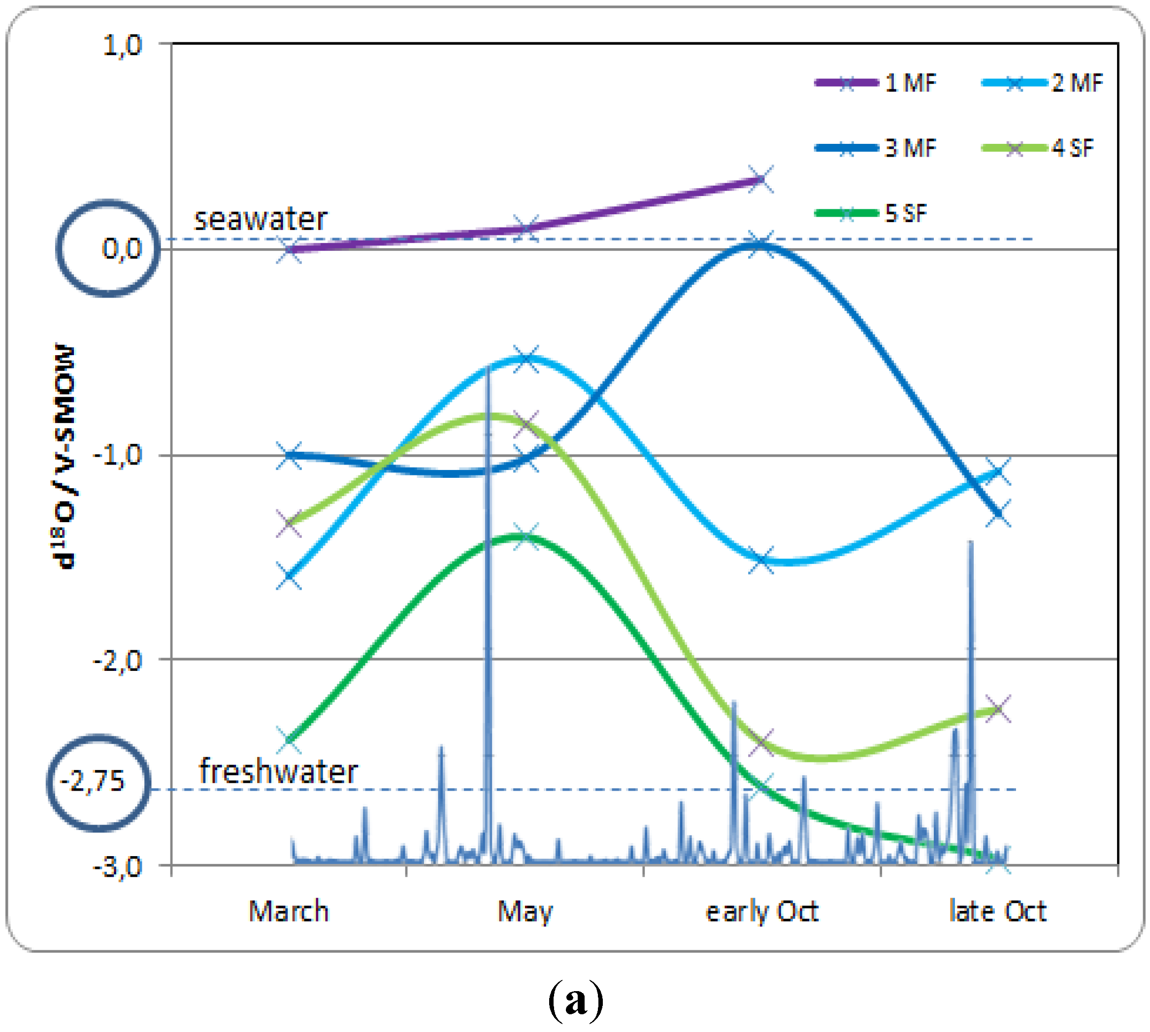 The monitoring of water level and soil salinity was completed by isotopic measurements. Figure 4a reports seasonal fluctuations of groundwater δ18O values, and Figure 4b reports that of soil salinity, from March to late October 2012. In the mangrove forest, groundwater at site 1MF only contained seawater (δ18O closed to +0.2‰) and soil salinity remained closed to that of seawater (35 g·L−1). The two mangrove sites located more inland (2MF and 3MF) showed isotopic values that indicate a mixture between fresh and seawater (about 50/50), with δ18O ranging from −1.6‰ to −1.0‰; however, soil salinity remained high, especially at site 3MF, due to salt accumulation resulting from evaporation. In early October, at the beginning of the wet season, δ18O values from the 2MF site dropped from −0.5‰ to −1.5‰. Such values indicate inputs of freshwater, although soil salinity remains quite constant. Conversely, the 3MF site reacted in late October with a drop of δ18O values from 0‰ to −1.3‰. The clay substrate of the 3MF site enabled slower water mixing than in the peat substrate of the 2MF site. The calculated deuterium excess [18] (between +10‰ to +20‰) revealed that during the dry season (March to May) globally no evaporation occurred in all mangrove sites. The only exception is the site 1MF which displays lower values, and negative values in mid-May and even early October. This means that outside the small mangrove band near the shore at 1MF, no ground-water evaporation occurred there, due to enough water availability.