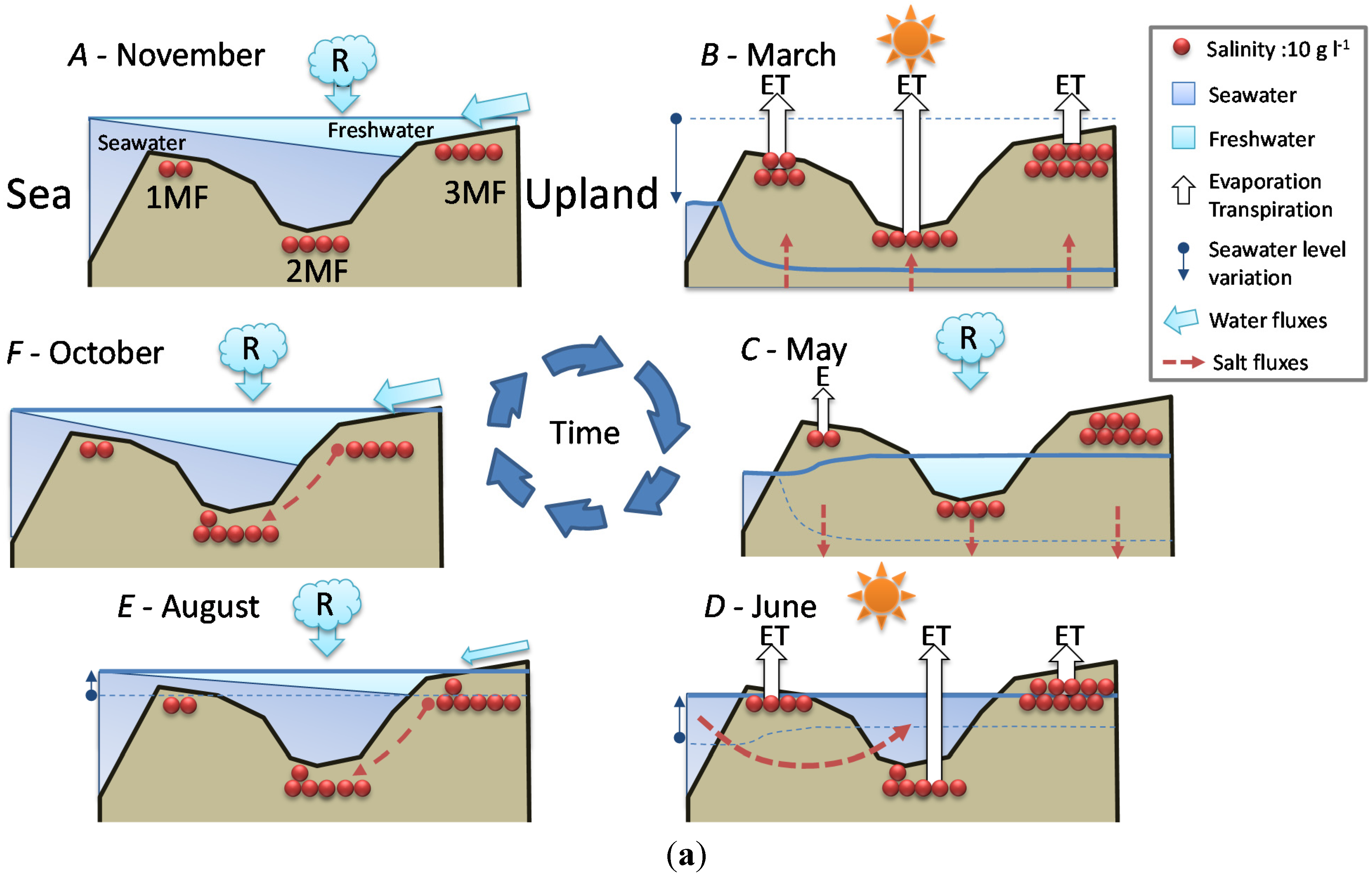 In order to better understand the seasonal dynamics of soil salinity and water fluxes, we have set up a conceptual framework highlighting mangrove (Figure 5a) and swamp forest (Figure 5b) distinctive features.