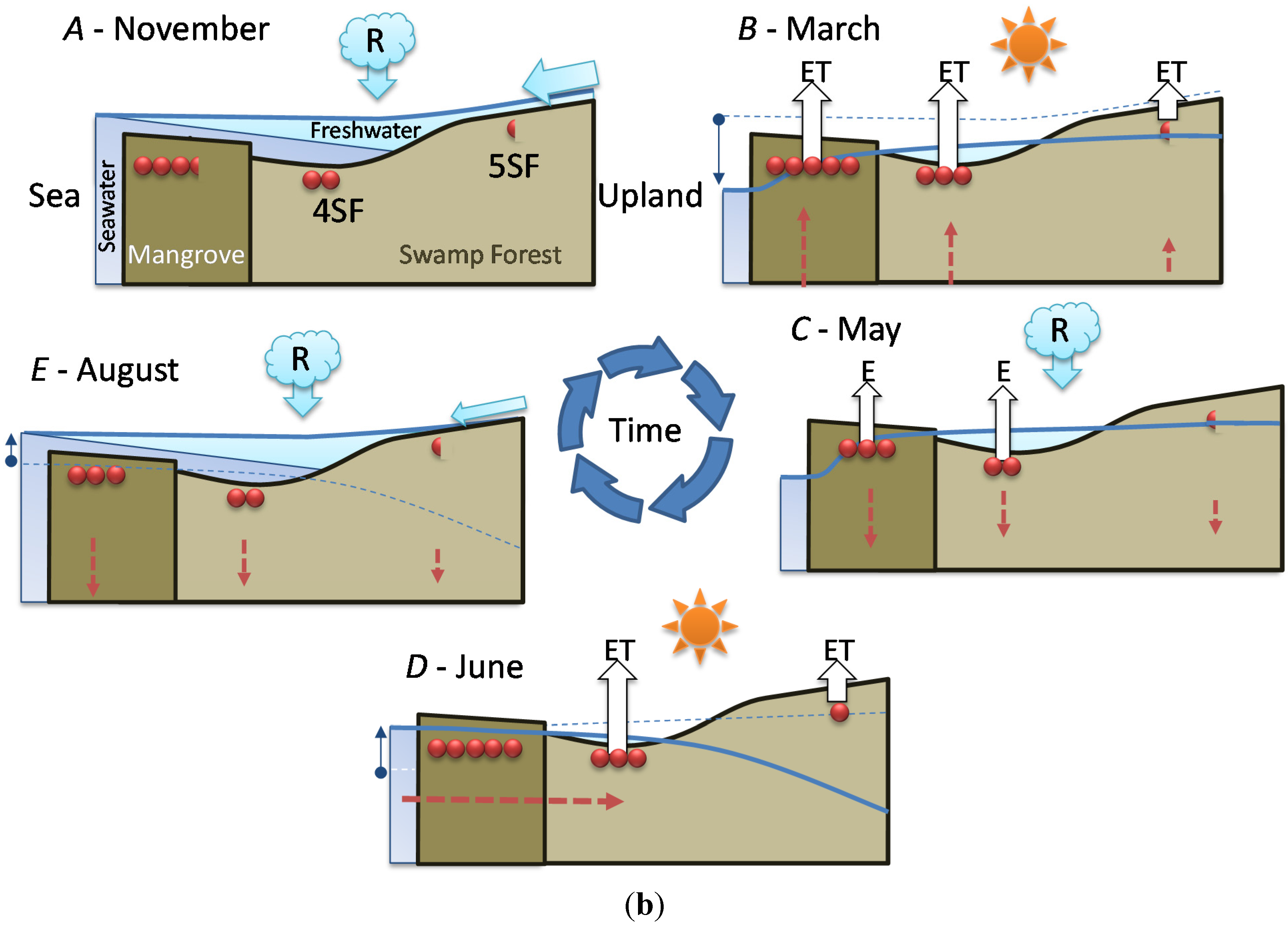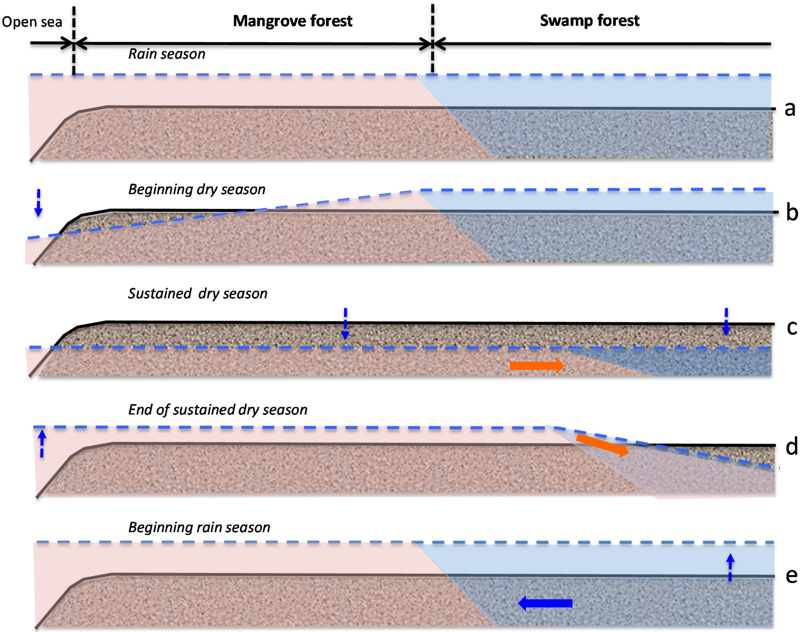 - Stage D: by the end of the dry season (June 2012), rainfall lowers again and evapotranspiration increases, causing soil salinity to rise everywhere. As atmospheric pressure lowers, sea level rises, and saltwater penetrates into the mangrove. This inflow of seawater takes the place of the (fresh) water losses by evapotranspiration, and increases salt concentration in the water table. Beyond the tidal area, the water table drops dramatically due to freshwater shortage, allowing in-depth, brackish groundwater intrusion inside the swamp forest.