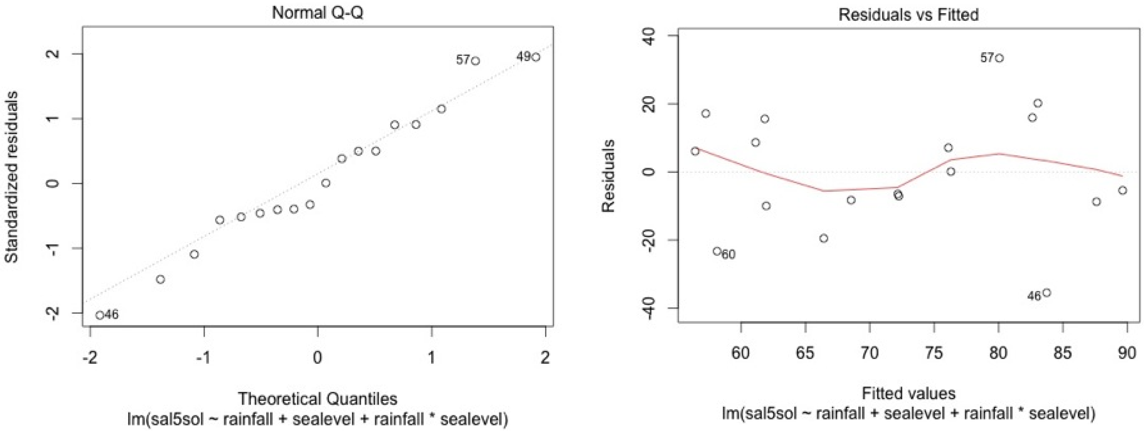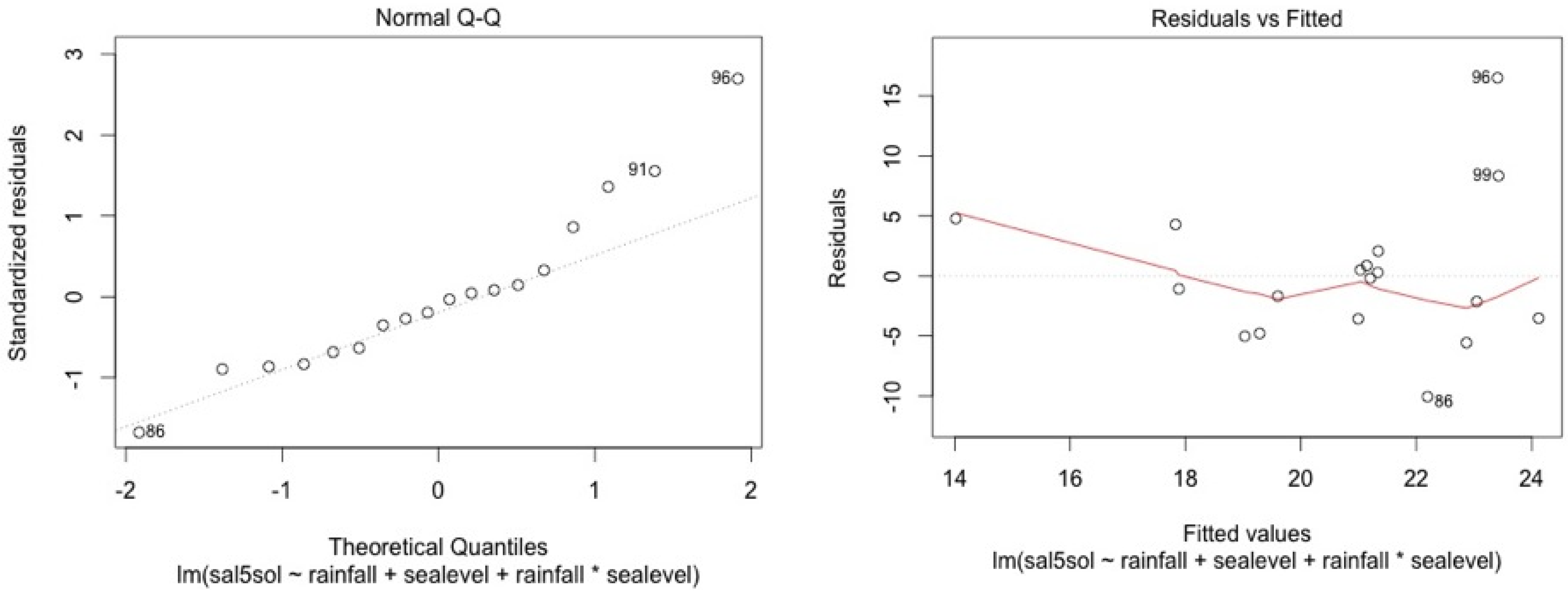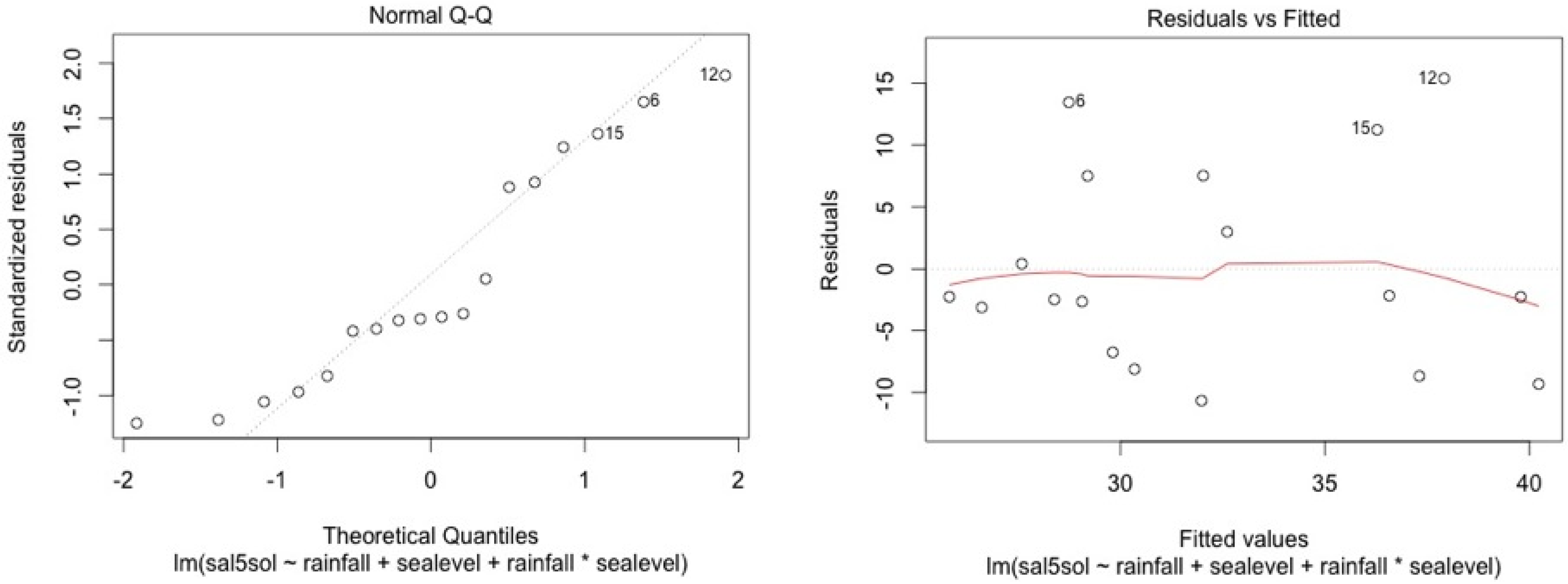 Graphical analysis show that this model is correct for the mangrove stations. However, heteroscedasticity can be noted for top soil salinity modelisation in the swamp forest stations. This is due to the dry season event. In the swamp forest, our model gives a good picture of the relationship between rainfall, sea level, and salinity during the major part of the year but our model appears not to be accurate in predicting the intensity of dry seasons.
