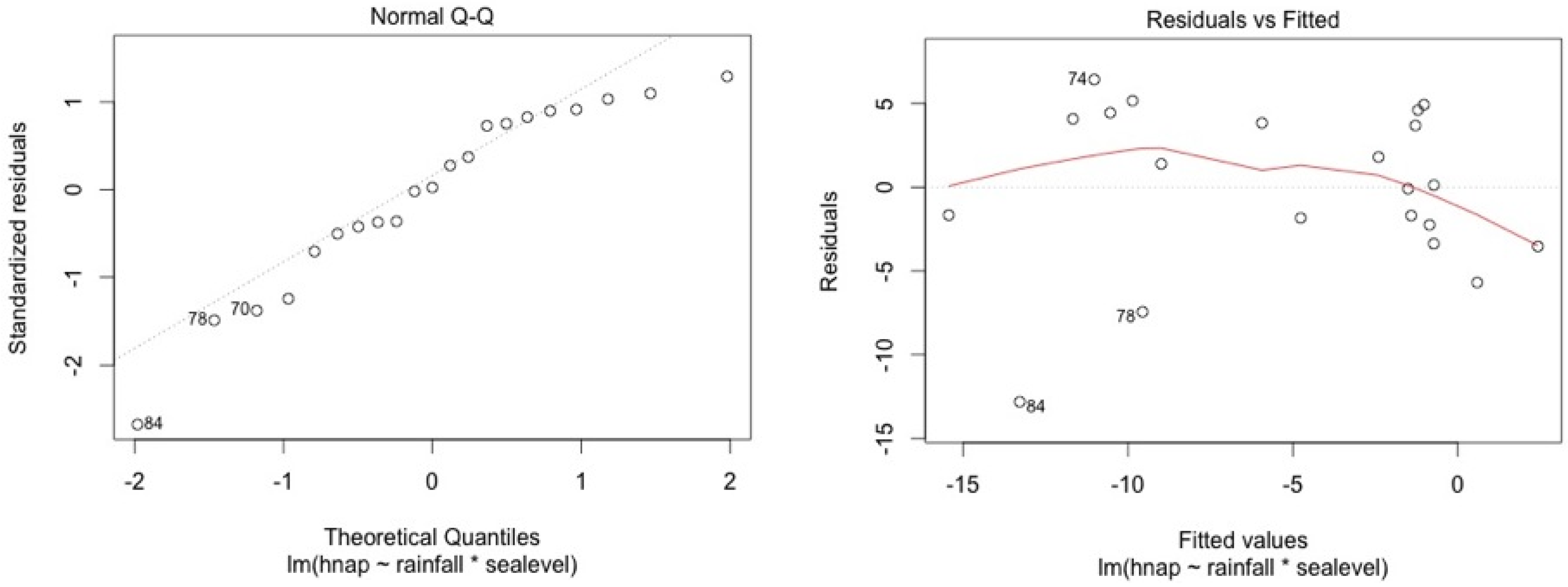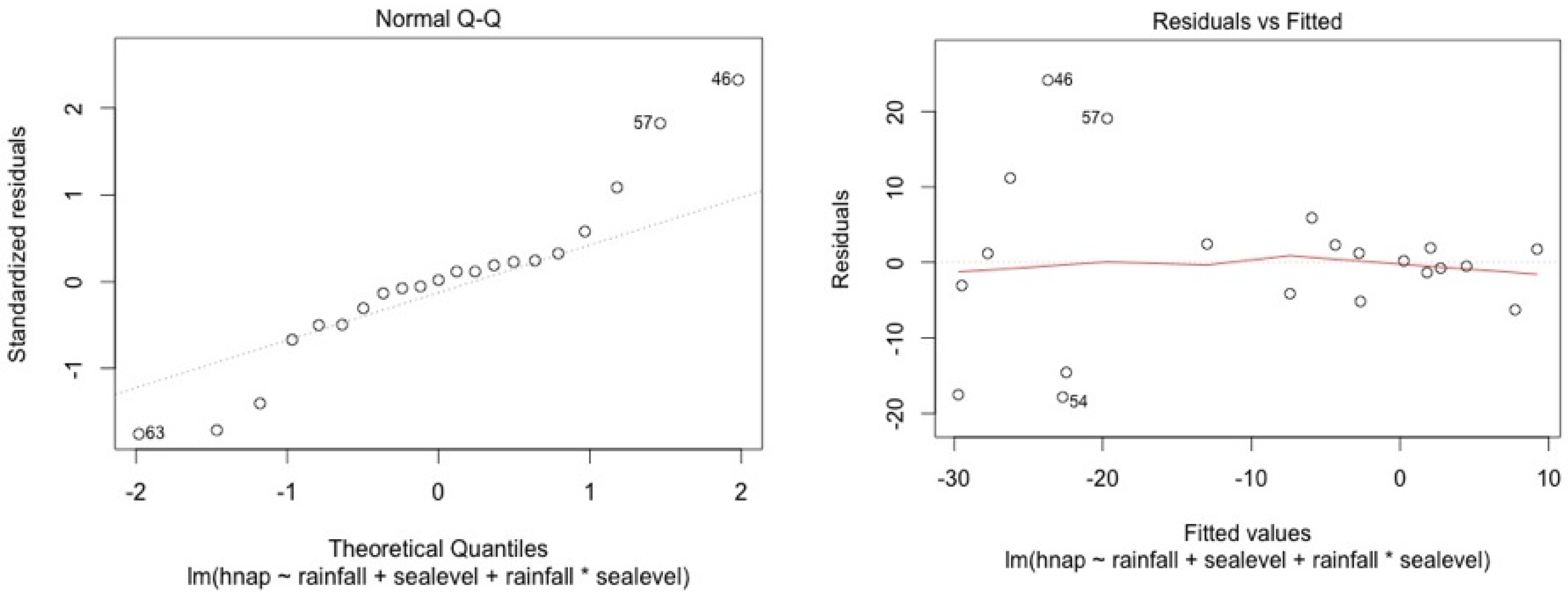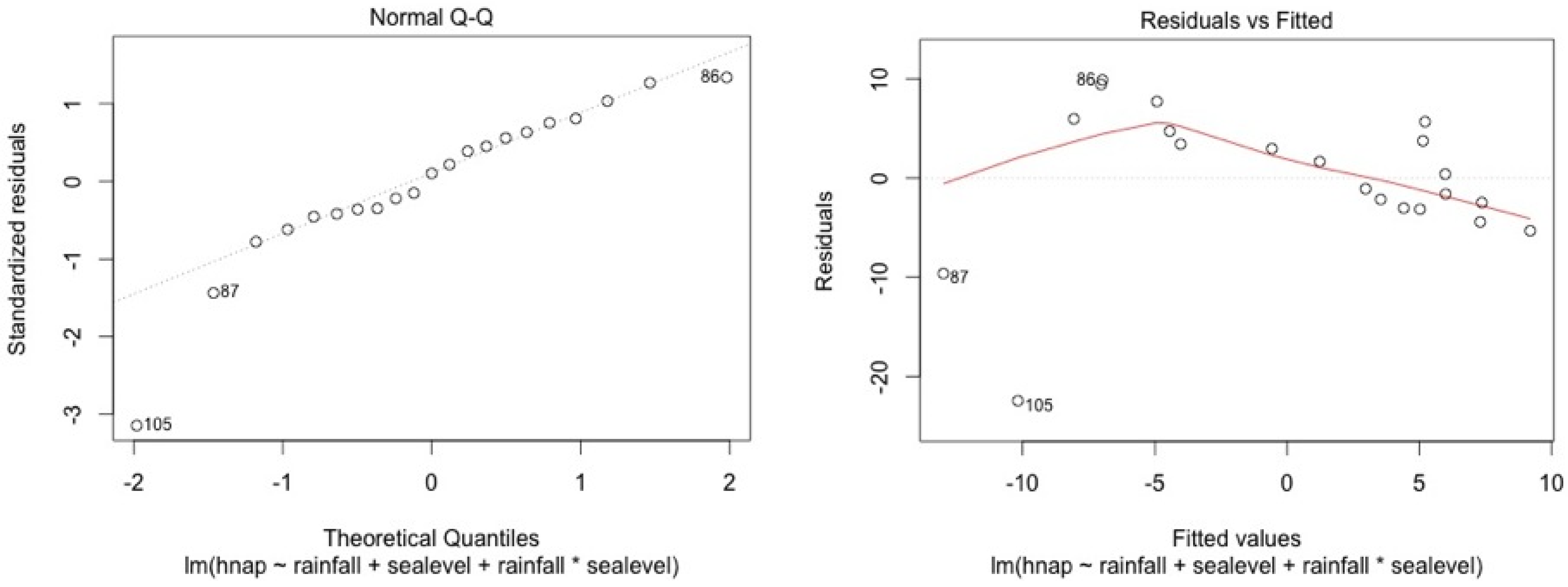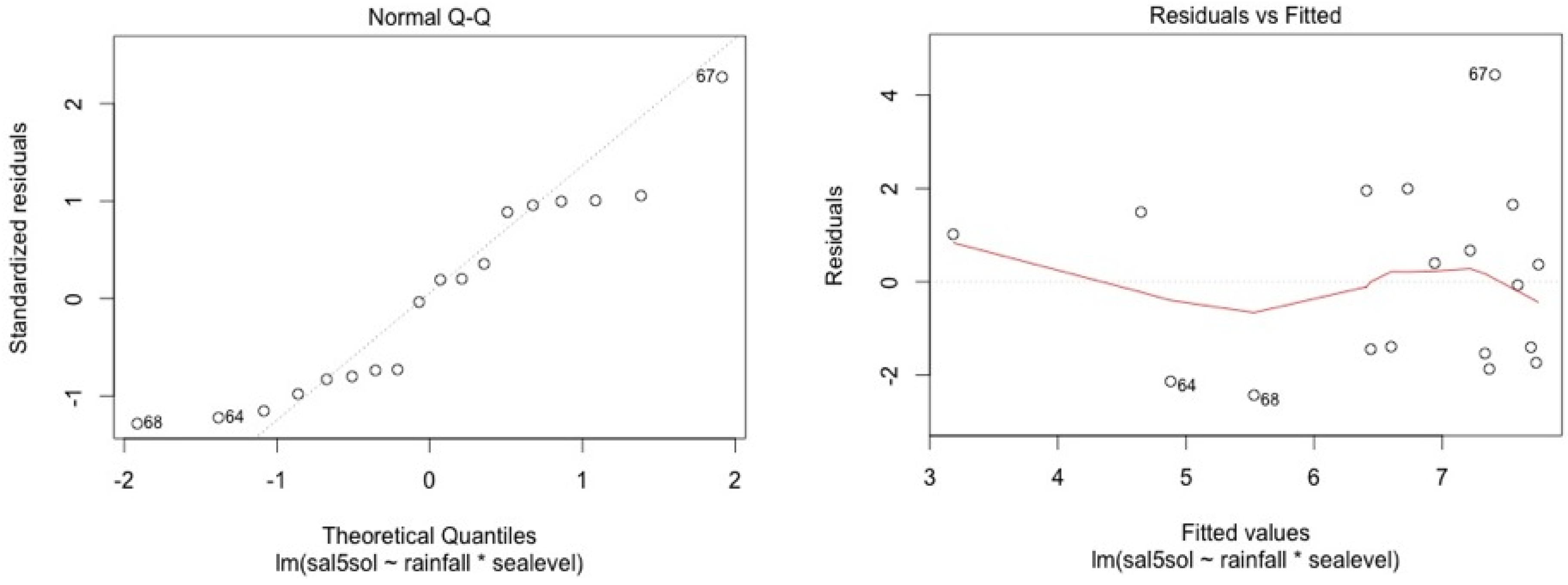Graphical analysis show that this model is correct for the mangrove stations. However, heteroscedasticity can be noted for top soil salinity modelisation in the swamp forest stations. This is due to the dry season event. In the swamp forest, our model gives a good picture of the relationship between rainfall, sea level, and salinity during the major part of the year but our model appears not to be accurate in predicting the intensity of dry seasons.