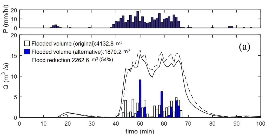 Figure 8a,b present the simulation results for storm events in 2010 and 2011, which show the cases with flooding whereas Figure 8c shows a case with no flooding with a storm event on 23 July 2014. The flooded volume in the urban surface area is shown as white bars under the hydrographs for the actual network and the grey bars denote the alternative (Gibbs’ model). The case with flooding (Figure 8a,b) showed no reduction in the peak flows. Instead, the flooded volume was reduced by 54% and 72%, respectively, compared to the actual (original) layout. In contrast, Figure 8c shows the simulation results for a rainfall event with no surcharging (flooding). The peak flow was reduced by 10.2% for the alternative layout obtained from one of Gibbs’ model with β = 10−4. The results with an alternative layout strongly highlight the importance of network configuration in terms of the reduction and mitigation of flood damages in urban environments.