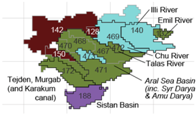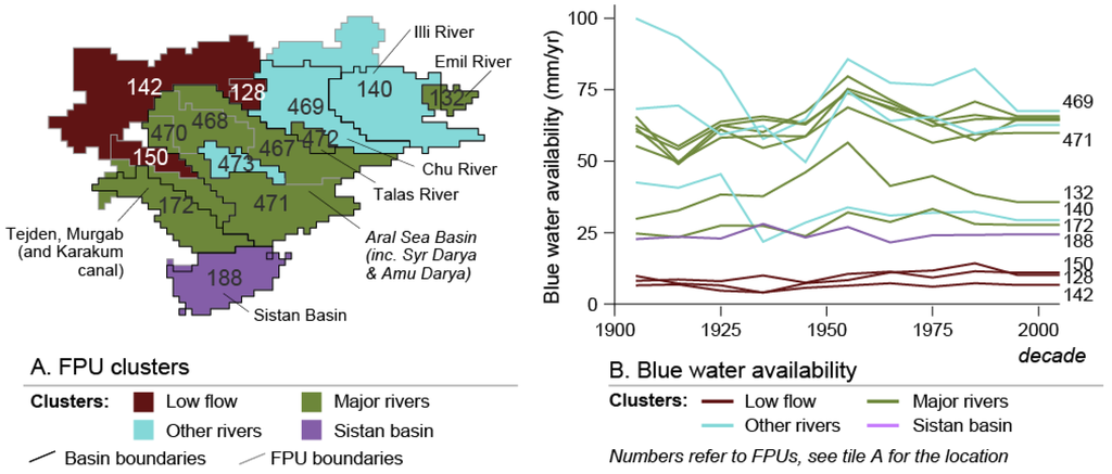 Water availability and consumptions were aggregated to Food Production Units (FPUs), which are a combination of river basin and economic regions used by a number of previous studies [4,40,41,42]. Other units of analysis may yield some variation in quantitative results [32]. FPUs are a hydro-politically relevant scale of analysis [40], and the conclusions drawn with this unit of analysis were found to be consistent with existing literature about Central Asia.