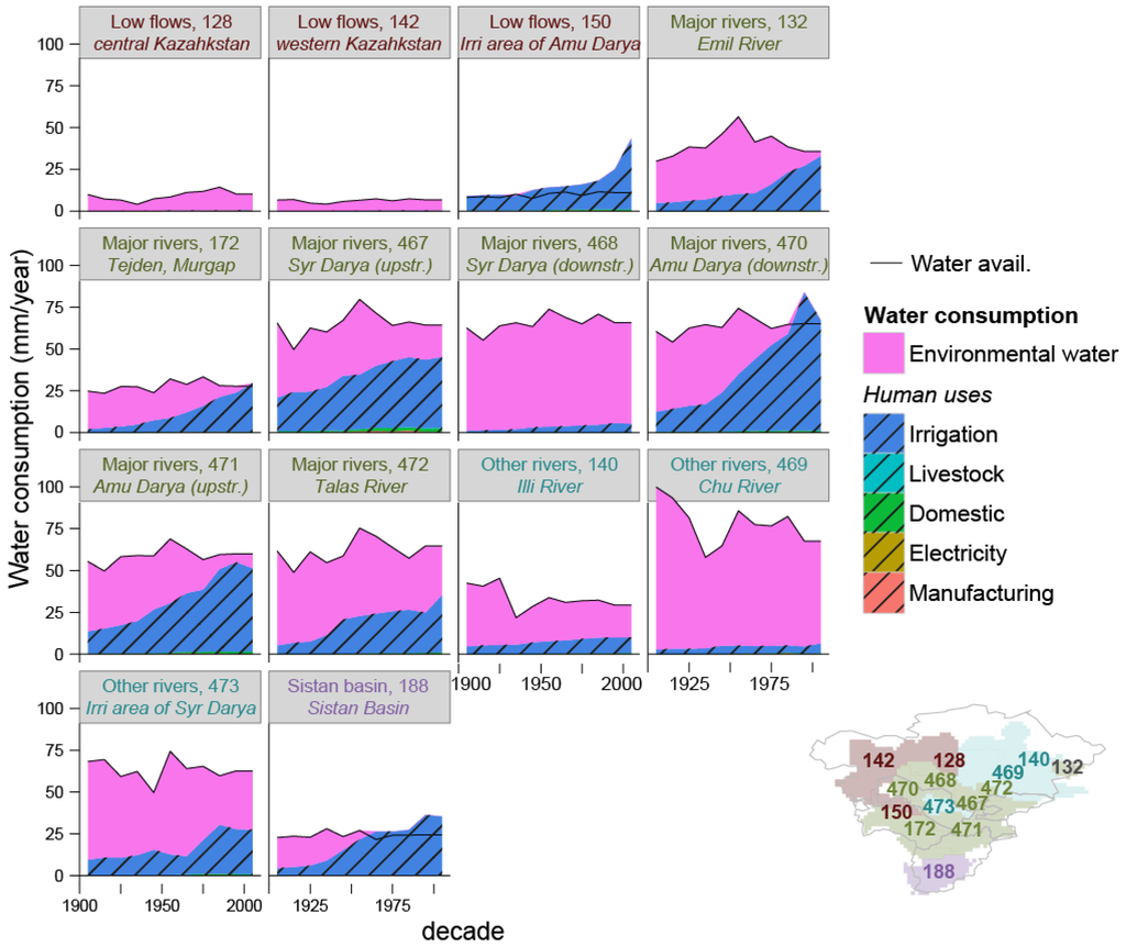 A core issue of the water-energy-food nexus is the trade-off between water-dependent activities. Time series of consumption for each sector are shown in Figure 5. Before interpreting this figure, it is important to remember that the nexus exists within a broader context. When a water resource is not stressed, all industries take as much as they want (at the increasing expense of environmental water). The environment acts as a buffer, mitigating conflict between uses. Similarly, when the population is small, there is less competition for water than when the population is large [48]. Only when water becomes scarce does meeting all activities’ water requirements become an issue. This is the case in some basins in Central Asia, which raises the need to understand the requirements and impacts of particular consumptive pathways.