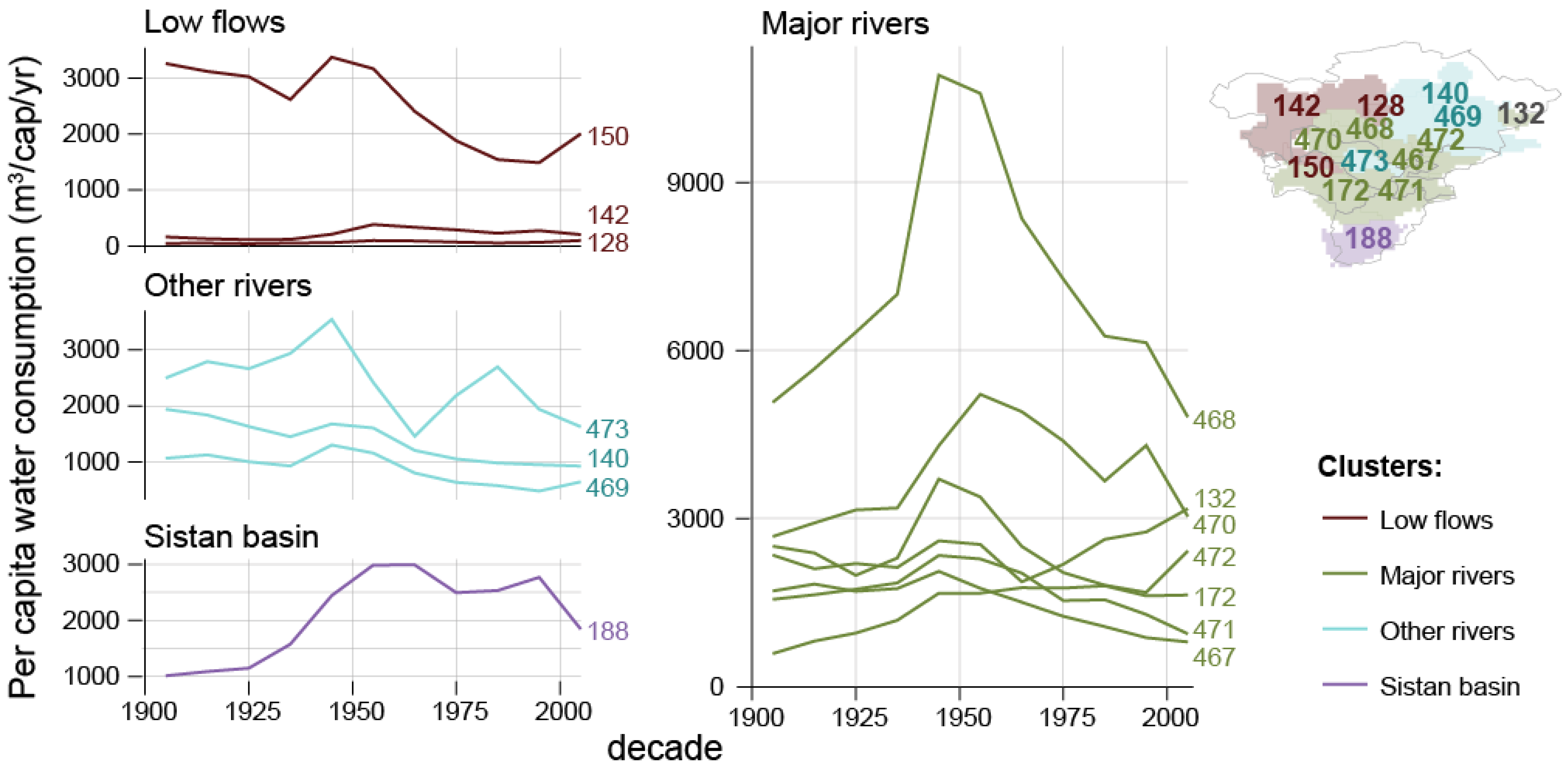 In general, the “major rivers” cluster is characterized by high water availability, driven by glacial and snow melt from the Pamir and Tien Shan mountains to the east [51]. This is a dominant feature of the region, as the arid downstream areas depend on the continental climate of these headwaters and the relative reliability of glacier flows [52]. The time series in Figure 2 does, however, show lower water availability at the start of the century, a peak in the middle of the century, followed by a return to lower levels, consistent with the strong role of observed climatic variation [51] and a cold, wet period in the 1950s [53]. There is, however, no clear trend of water availability, consistent with studies showing that climate change effects on runoff vary substantially between catchments, though increased temperature, evaporation, and glacier melt are generally accepted to be playing a major role [51]. Note that the model used here does not explicitly represent glacier melt, though it is still considered to have acceptable performance in Central Asia [27,28], at least for the purpose of this paper.