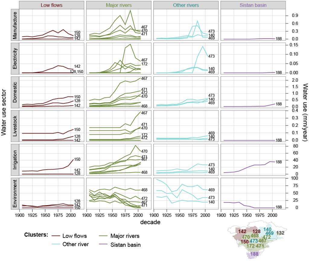 National time series of manufacturing water use are estimated based on the gross value added (GVA) economic measure, technological change rates, and consumptive-use-coefficients [31]. Country-scale estimates are allocated to grid cells according to the distribution of the urban population. Consistent with Central Asia’s turbulent history, manufacturing water use has varied significantly in a number of FPUs, with a dip in the 1970s, followed by a temporary increase in the 1980s, and a fall since the 1990s with the dissolution of the Soviet Union. Manufacturing water consumption is small relative to agriculture, but generally results in the production of higher-value goods. As noted by Stucki and Sojamo [22], manufacturing provides a larger contribution to GDP than agriculture while using far less water.