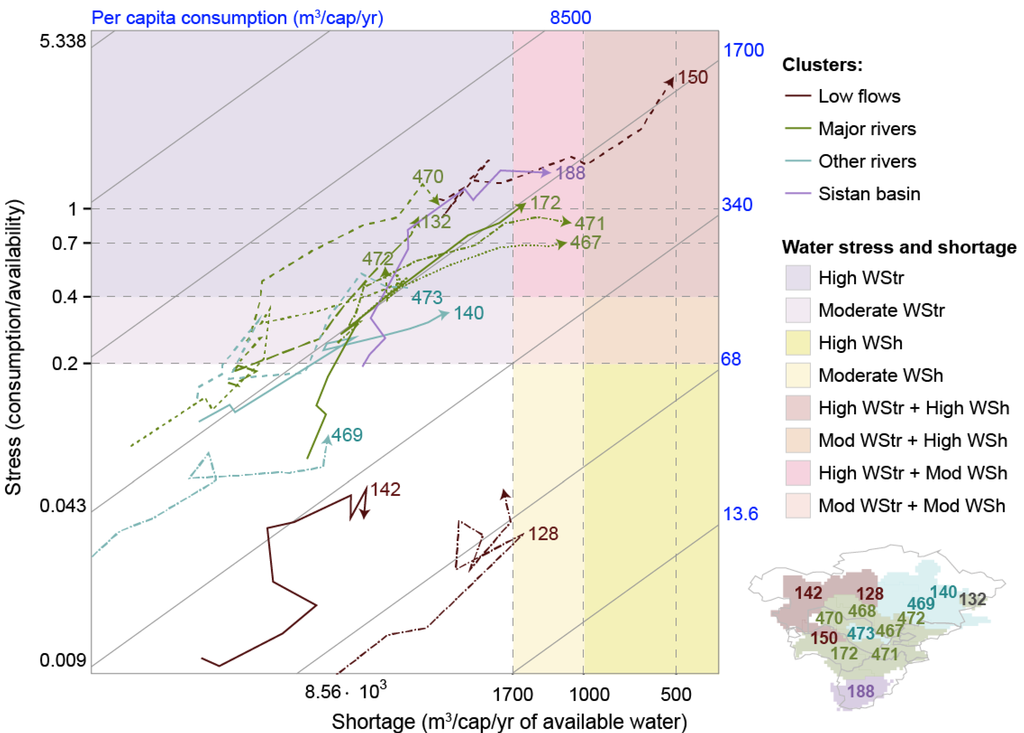 The preceding sections discussed the role of decadal water availability and consumption within the history of the nexus in Central Asia. These issues are closely related to the concept of water scarcity, in particular through the water stress and shortage indicators. Figure 6 shows the trajectories of each FPU over time in terms of these two indicators.