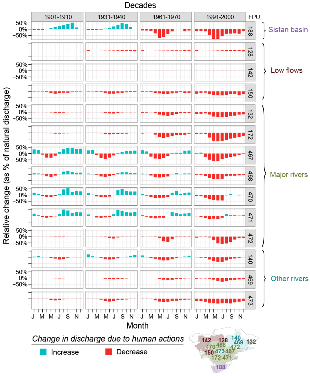 Monthly change in discharge due to human influence, relative to natural discharge, averaged for decades from 1905–2000. Estimated discharge under a natural scenario is subtracted from estimated discharge including human influences, i.e., with flow regulation and water abstraction.