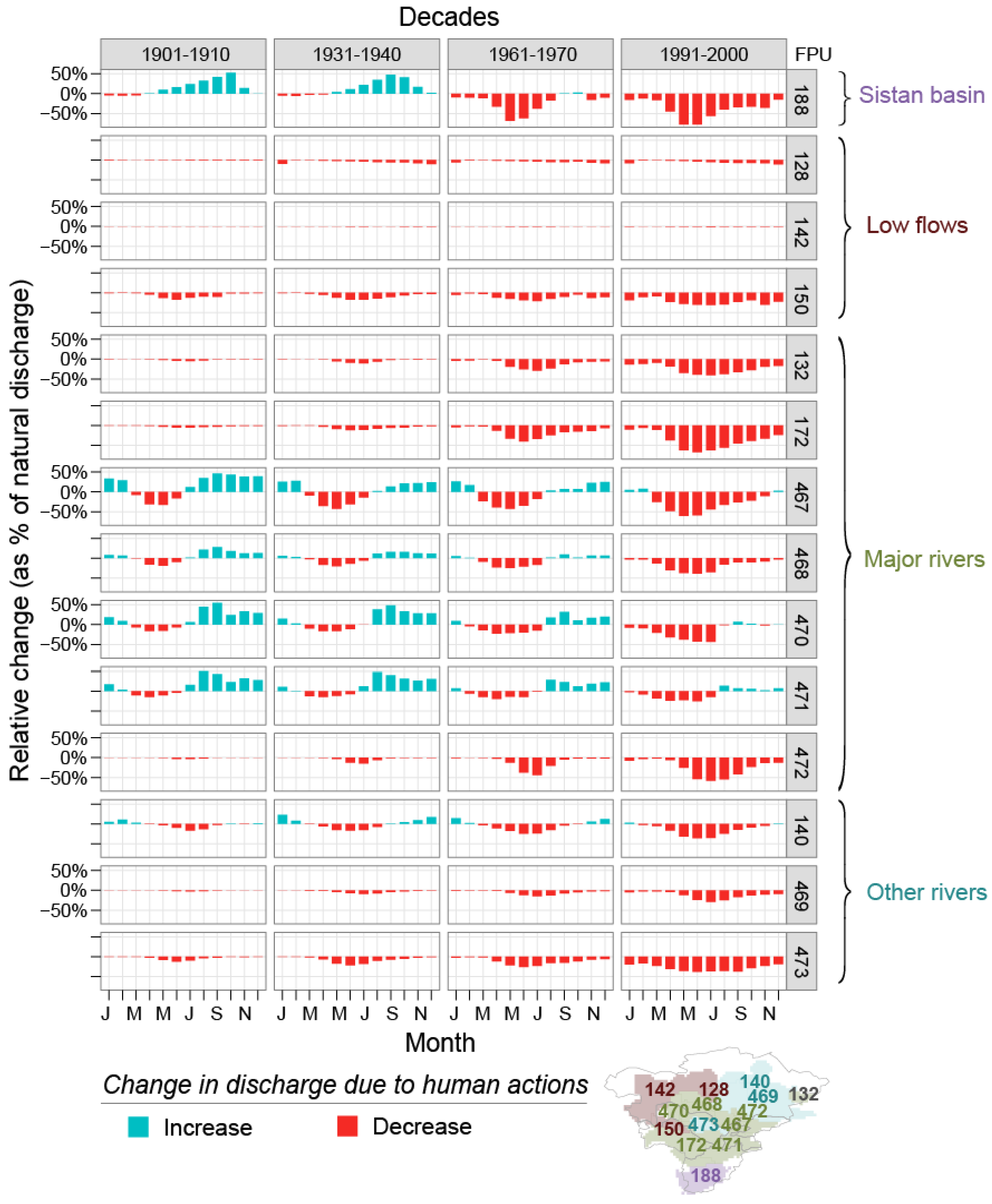 Previous sections focused on decadal change, which does not show human impacts at shorter time scales. Figure 7 shows the monthly change in discharge between human and natural scenarios, summed for each FPU, and averaged across each decade, obtained using two model setups as described in Section 2.1. Relative changes are expressed as a percentage of natural discharge. This emphasizes changes in environmentally important low flows rather than high flows [60].