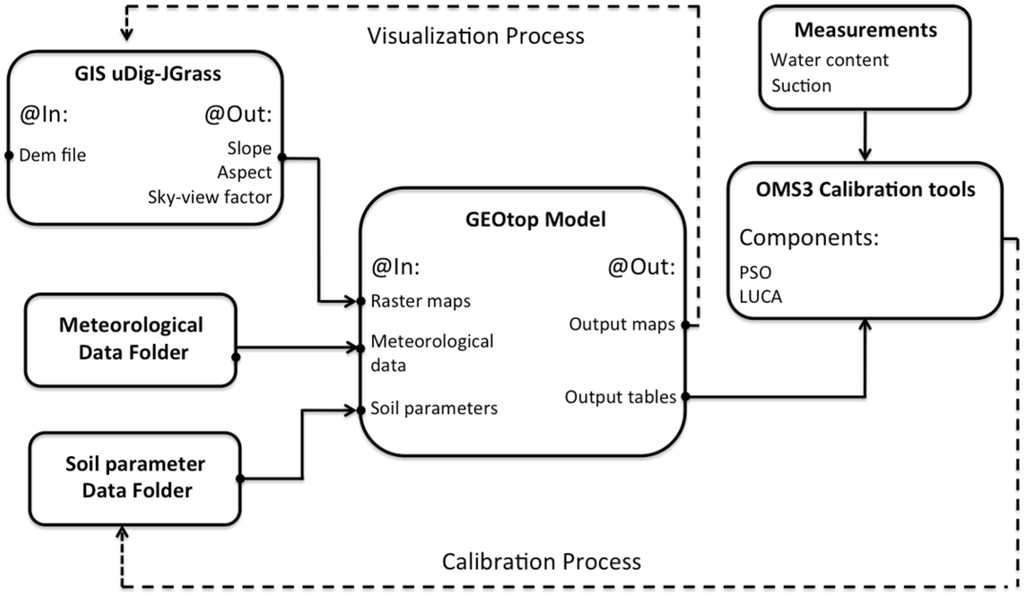 The main contribution of this work is the integration of the physically based GEOtop model into a modeling framework, which provides direct connections with (1) a geographical information system (GIS) uDig-JGrass in order to manage input/output processes, and (2) advanced automatic calibration algorithms. The work presented here will allow future connections based on the OMS standards between GEOtop and other hydrological models, such as NewAge-JGrass [13], AgES [14] or AgES-W [15], and PRMS-OMS [16]. NewAge-JGrass ([13,17]) is a large-scale semi-distributed hydrological model; AgES simulates nutrient transport and crop growth coupled with hydrological processes; and PRMS [18] simulates the impacts of various combinations of precipitation, climate, and land use on streamflow and sediment yields.