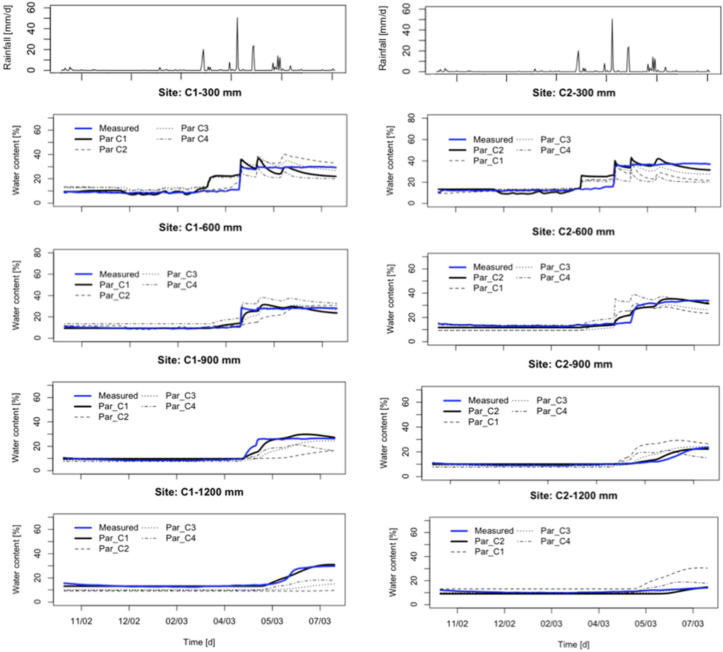 The model is able to simulate the main wetting front and stable patterns of the SM profile both at low-saturation (September–March) and to a better degree at high-saturation (March–August) periods. This is also confirmed by the indices of goodness-of-fit reported in Table 2. Generally, the best performances were achieved by using the parameter set estimated in the same locations where calibration is performed (e.g., parameter set Par_C1 gives the best results in location C1). For a given depth, the optimal parameter set at other locations may show better results in comparison to the optimal parameter set that was calibrated for the given location. For example, the optimal parameter set of Par_C2 showed smaller RMSE (4.03) for SM_C1_300 than for the optimal parameter set Par_C1 (5.02) (see Table 2). Moreover, the simulated SM at probe C1, 300 mm depth using Par_C2 reproduced the measured SM better during March–April compared with the simulation using Par_C1 (Figure 5). This happens only for SM_C1_300, but in the other locations the RMSE values using Par_C2 are much higher than using Par_C1 (4.30 vs. 2.10 for SM_C1_600, 2.2 vs. 7.6 for SM_C1_900, and 1.08 vs. 6.4 for SM_C1_1200). This example shows how the parameter set Par_C1 is “globally” optimal for the site C1, where the term “globally” indicates the fact that the algorithm simultaneously optimizes the parameters in the four locations C1_300, C1_600, C1_900, and C1_1200.