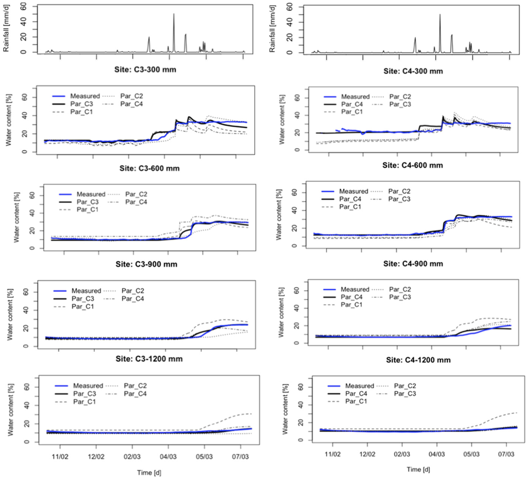 Soil moisture dynamics at different depths (300, 600, 900 and 1200 mm) in locations C3 and C4. The blue bold lines are the measured data. The black lines are simulated SM values computed by using different parameters set (Par_C1, Par_C2, Par_C3, and Par_C4) as specified in the legend.