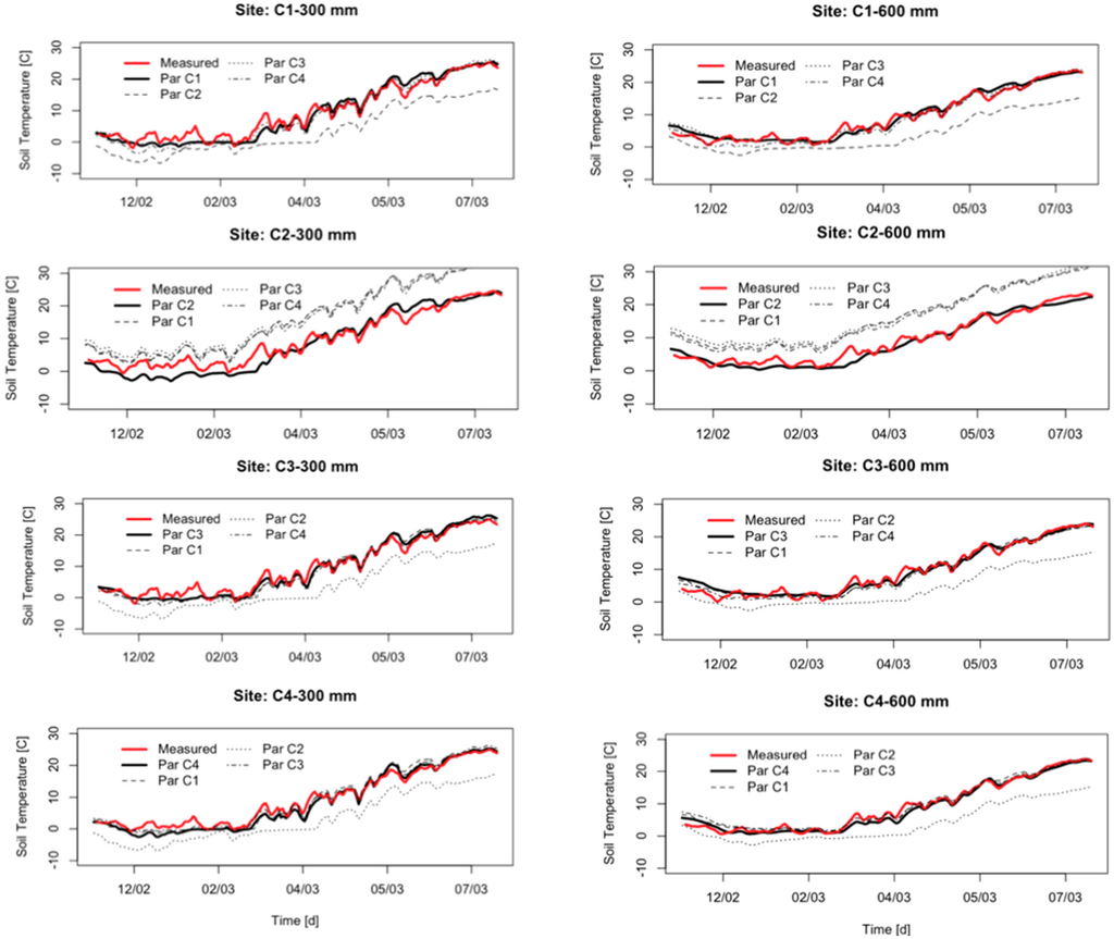 Soil temperature dynamics at different depths (300 and 600 mm) in locations C1, C2, C3, and C4. The red bold lines are the measured data. The black lines are simulated ST values computed by using a different parameters set (Par_C1, Par_C2, Par_C3, and Par_C4), as specified in the legend.